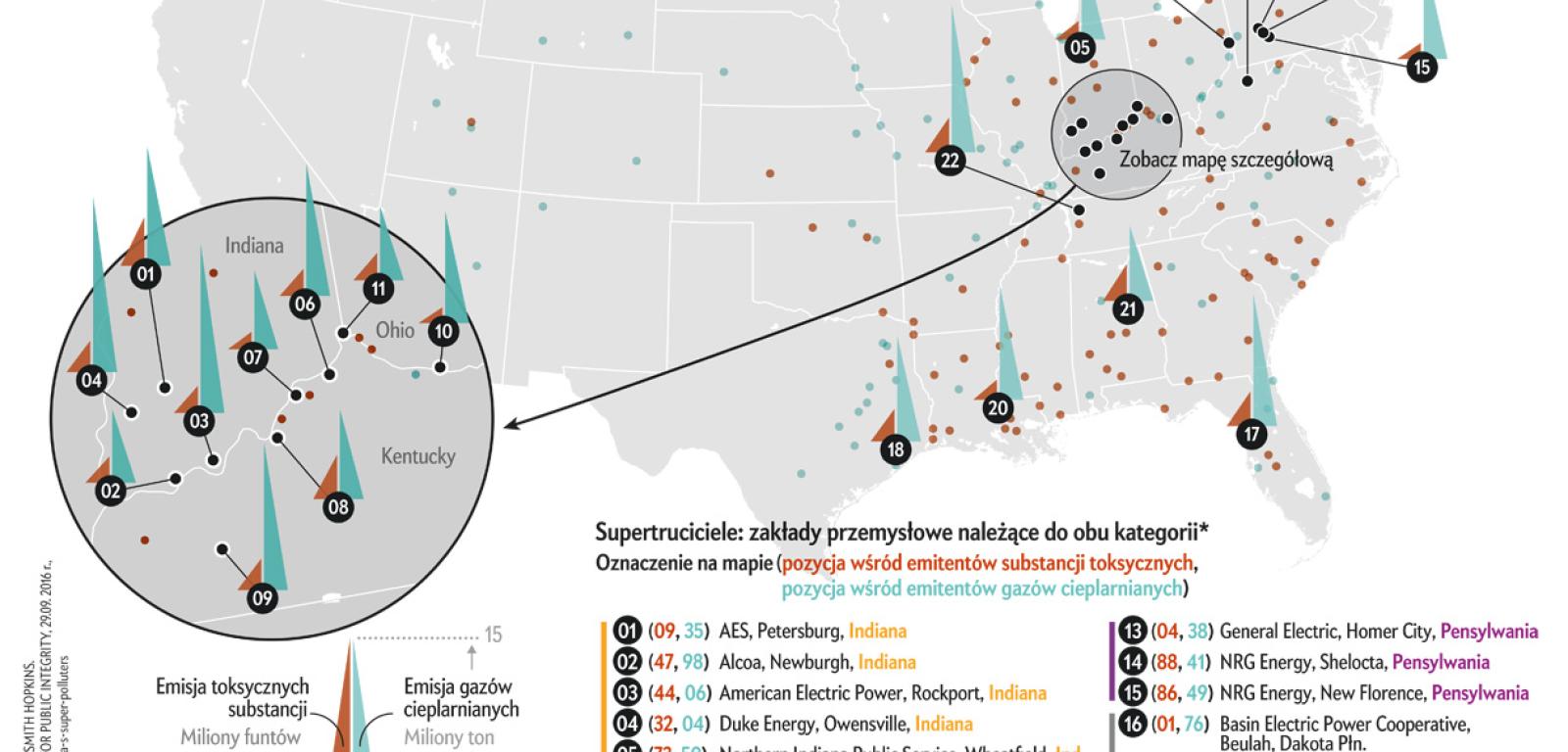 Zaledwie 100 instalacji, spośród około 20 000 istniejących w USA, wyprodukowało w 2014 roku jedną trzecią wszystkich toksycznych zanieczyszczeń atmosferycznych. Kolejne 100 zakładów odpowiada za jedną trzecią emisji gazów cieplarnianych, na około 7000 instalacji wypuszczających w powietrze te związki. Według ustaleń ośrodka Center for Public Integrity (CPI), który przygotował oba rankingi, na jednym i drugim znalazło się 22 „supertrucicieli” (wymienionych poniżej).