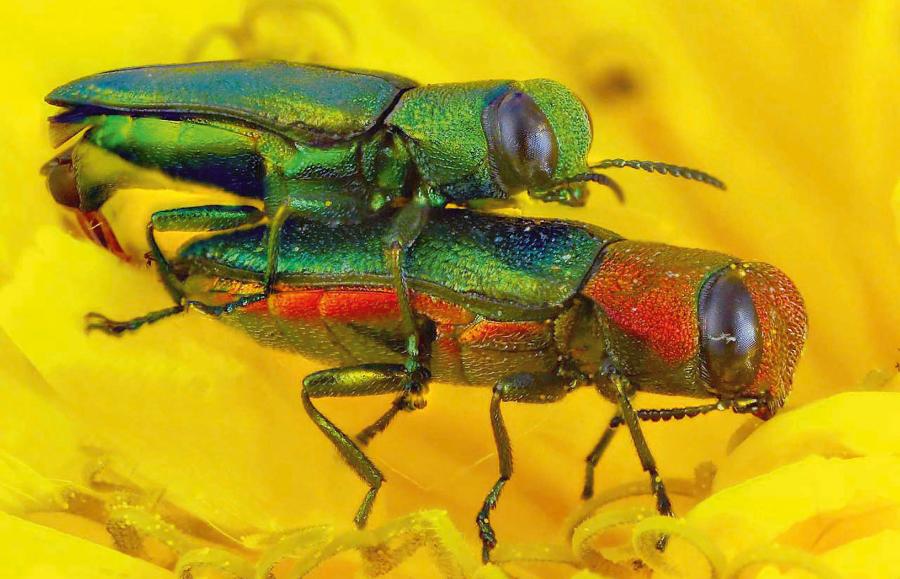 A względy regulacji temperatury ciała? Owady o jubilerskim wyglądzie są z reguły światłolubne (ang. sun loving animals) i często przebywają na mocno ogrzanych płaszczyznach. Mniej to dotyczy owadów siedzących na liściach. Ze wzrostem temperatury liście zwiększają transpirację, która wydajnie chłodzi ich bezpośrednie otoczenie. Nie mają tego luksusu chrząszcze i błonkówki biegające po gorącym piasku, glinianych bądź skalnych ścianach czy nagrzanych pniach drzew. Teoretycznie silne odbijanie promieniowania słonecznego przez powierzchnię ciała powinno zapobiegać przegrzewaniu organizmu. Wiadomo, że metaliczne powierzchnie odbijają takie promieniowanie, zwłaszcza fale krótkie (zbliżone do ultrafioletu), które przenoszą pewną ilość energii cieplnej. Mogą one także rozpraszać światło, co pomogłoby utrzymać niższą temperaturę ciała. A co wykazały badania? W artykule „Pretty Cool Beetles: Can Manipulation of Visible and Near-Infrared Sunlight Prevent Overheating?” (po angielsku pretty cool może znaczyć „dobrze schłodzone” lub „urodziwe”) Laura Ospina-Rozo i jej współpracownicy z Australii wzięli na warsztat tzw. chrząszcze bożonarodzeniowe (Anoplognathus spp.) z rodziny żukowatych. Większość z nich jest skromnie ubarwiona (brązowo), ale są też gatunki pysznie zielonozłote. Naukowcy badali wpływ metalicznej barwy pokryw tych chrząszczy na wydajność ochrony ich ciała przed przegrzaniem. Różnice między gatunkami nie były duże. Zielonozłote obniżały temperaturę ciała w pełnym słońcu o 3–5°C, przy czym większą rolę odgrywały tu własności refleksyjne metalicznej kutykuli niż rozpraszające. Brązowe chrząszcze mogły jednak kompensować brak metaliczności większymi rozmiarami oraz większą odległością pokryw od odwłoka, co stwarza izolującą poduszkę powietrzną.