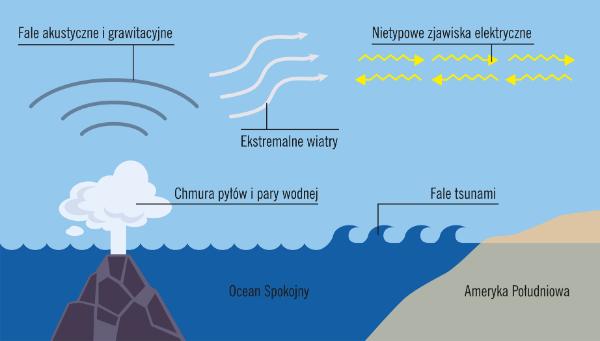 Chociaż od największej do tej pory erupcji wulkanicznej w XXI w. – wybuchu wulkanu Hunga Tonga-Hunga Ha’apai w pacyficznym Królestwie Tonga w 2022 r. – upłynęło półtora roku, zainteresowanie nią wśród naukowców nie mija. Kolejne ich doniesienia przekonują nas, że było to zdarzenie pod wieloma względami wyjątkowe. Dotyczy to także najnowszej publikacji, która ukazała się w czerwcu w „Geophysical Research Letters”. Jej autorzy informują, że w gigantycznej chmurze pyłów i gazów, która uniosła się podczas erupcji, wygenerowanych zostało łącznie ok. 200 tys. wyładowań atmosferycznych.