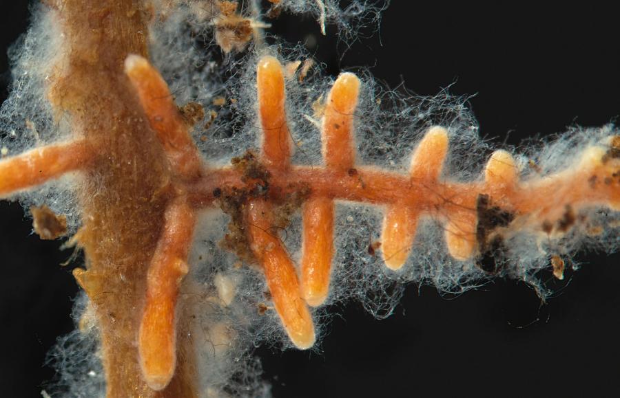 Rola korzeni w magazynowaniu węgla w glebie na tym się nie kończy. Szczególnie ważne są tzw. korzenie mikoryzowe, czyli korzenie roślin żyjące w symbiozie z korzeniami grzybów. Podczas gdy roślina zaopatruje grzyb w cukry, ten swoimi długimi i cienkimi korzeniami eksploruje glebę w poszukiwaniu dla niej wody i składników mineralnych. Podobnie jak korzenie chłonne, mikoryzowe także cechuje wysoki wskaźnik odnowy, a ich tkanki rozkładają się w glebie bardzo powoli. Ale to nie wszystko! Zespół badaczy z Finlandii wykazał w 2019 r., że taniny produkowane przez korzenie sosny zwyczajnej chętnie reagowały z niektórymi związkami wydzielanymi przez grzyby, a w szczególności z chityną, tworząc bardzo stabilne w czasie kompleksy. Kompleksy te powstawały w miejscach splotu korzeni grzyba i drzewa, głównie w momencie obumarcia tych organów. Ot, kolejna strategia natury na związanie węgla w glebie.
