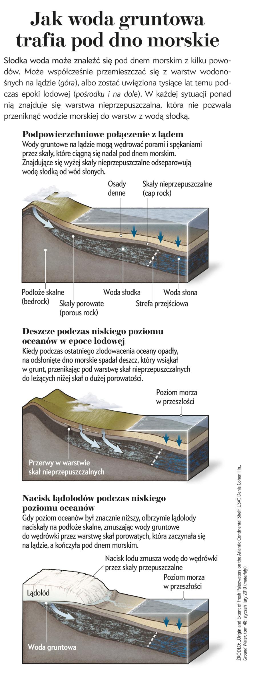 Szelf towarzyszący atlantyckiemu wybrzeżu USA ma szerokość od niemal zera aż do 300 km. Nie jest żadną niespodzianką to, że warstwy geologiczne, w których powstały poziomy wodonośne, nie kończą się na brzegu morskim, ale biegną dalej, stanowiąc część szelfu. Deszcz, który spada na ląd, wsiąka weń, a deszczówka dociera do poziomu wodonośnego ciągnącego się w szelfie i wychodzącego na powierzchnię dopiero na dnie morskim. Aby jednak taka długodystansowa podróż była możliwa, a woda pozostała zdatna do picia, powyżej morskiego poziomu wodonośnego musi się znajdować nieprzepuszczalna warstwa skał – zwykle są to zbite osady bogate w iły. Skały ilaste mają tę paradoksalną cechę, że mogą pomieścić olbrzymie ilości wody, gdy są luźne, ale gdy stają się zwarte, woda gruntowa nie jest w stanie ich pokonać. Taka warstwa nieprzepuszczalna ponad poziomem wodonośnym uniemożliwia słodkiej wodzie, która ma mniejszą gęstość od wody słonej, wędrówkę do góry i dotarcie do dna morskiego.
