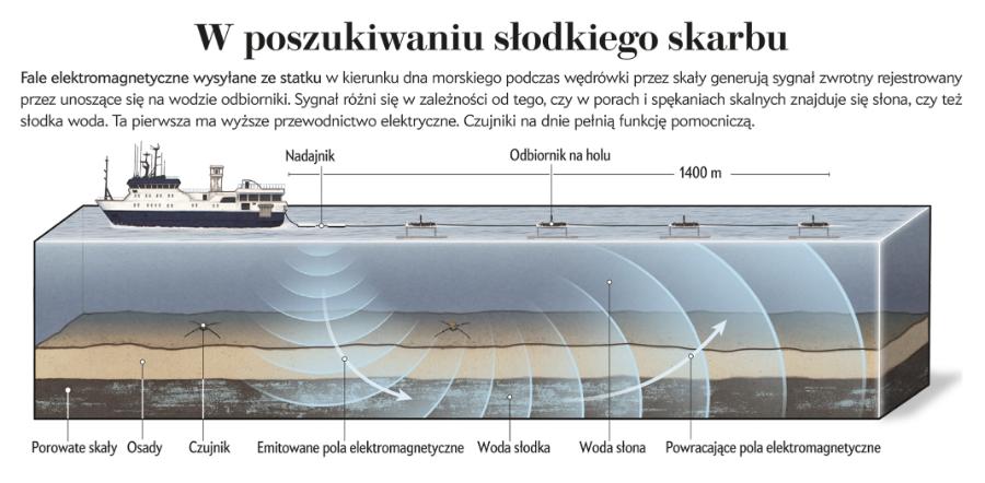W jednym z miejsc, gdzie – jak wskazywały wszystkie inne dane – powinniśmy się natknąć na drobnoziarniste osady mułowe z dużą zawartością wody morskiej, instrument przesłał informację, że natrafił pod dnem na rozległy rezerwuar wody słodkiej o powierzchni około 50 km2. Najwyraźniej wody gruntowe docierały aż pod dno oceanu, a następnie wypływały na powierzchnię spękaniami i szczelinami. Wtedy po raz pierwszy doszliśmy do wniosku, że dzięki detekcji elektromagnetycznej można poszukiwać słodkiej wody skrywającej się po dnem morskim.