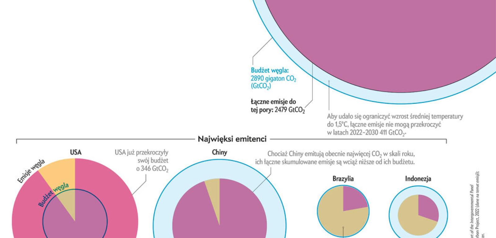 Aby prawdopodobieństwo zatrzymania wzrostu średniej temperatury globalnej poniżej progu 1,5°C, licząc od początku epoki przemysłowej, wyniosło 50%, świat powinien ograniczyć do około 500 mld ton łączne emisje dwutlenku węgla w latach 2020–2030. Obecnie emisje te wynoszą niemal 40 mld ton rocznie i wciąż rosną, co oznacza, że możemy łatwo przekroczyć ten budżet, a po roku 2030 kontynuować wzrost emisji. Jednak udział poszczególnych krajów w tym procesie nie jest równy.