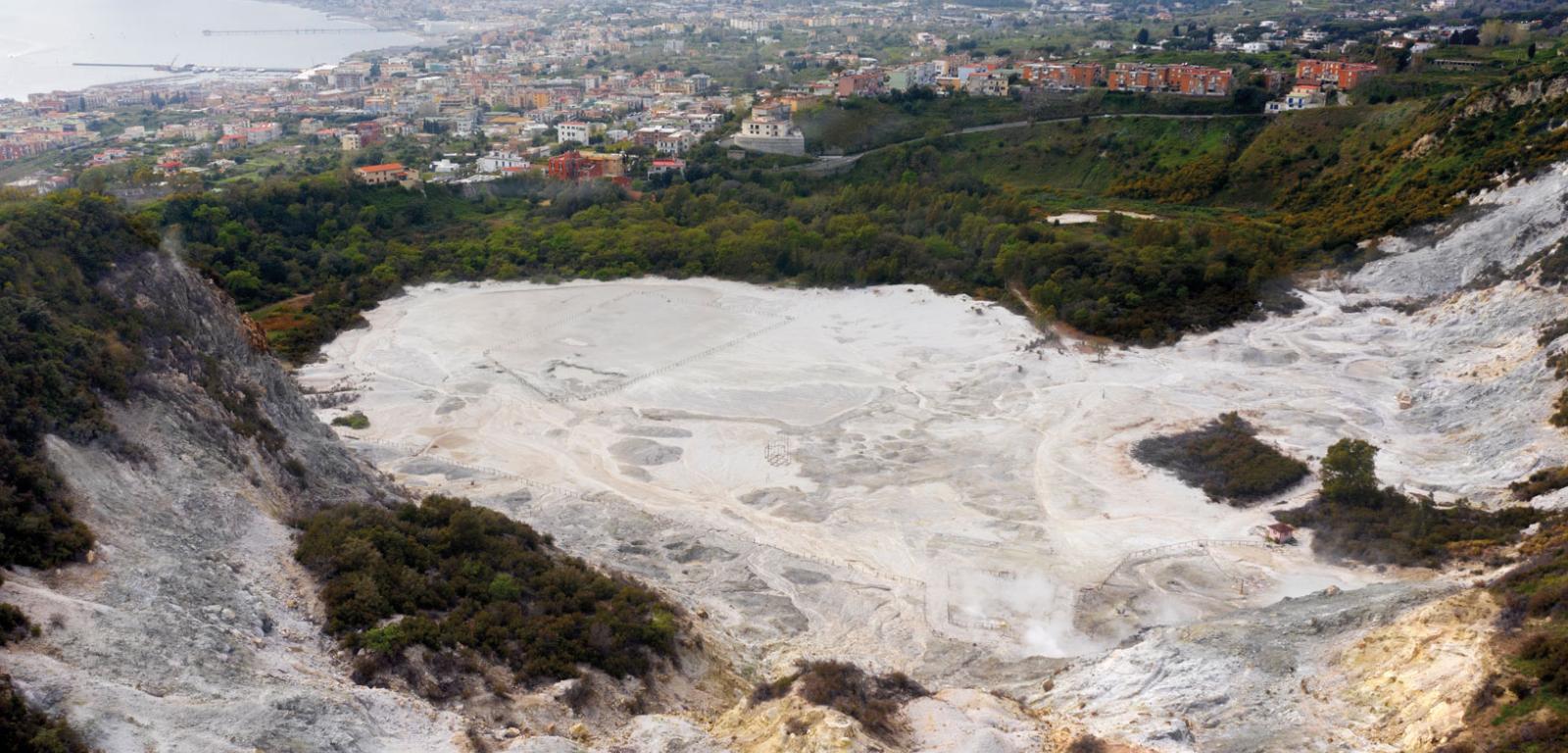 Mieszkańcy Półwyspu Apenińskiego zwą tego zdradliwego kolosa Campi Flegrei (płonące pola, od gr. „phlego” – „płonąć”), po polsku Pola Flegrejskie. Starożytni Rzymianie wierzyli, że tu znajduje się wejście do podziemnego świata umarłych. Niedaleko nad morzem w Baiae – luksusowym kurorcie z gorącymi źródłami – znajdowały się wille Juliusza Cezara, Nerona i Hadriana. Kaldera Pól Flegrejskich jest stosunkowo mało rozległa (średnice największych wynoszą około 100 km) – ma rozmiary 15 na 12 km, jest jednak największą tego rodzaju strukturą w Europie. Od wschodu sąsiaduje z nią dwumilionowy Neapol. Mniej więcej jedna trzecia kaldery, ta najniższa, została zalana przez wody Morza Tyrreńskiego i obecnie tworzy Zatokę Pozzuoli. Nad brzegiem zatoki powstało miasto o takiej samej nazwie liczące dziś około 80 tys. mieszkańców. Żyją w samym środku kaldery.