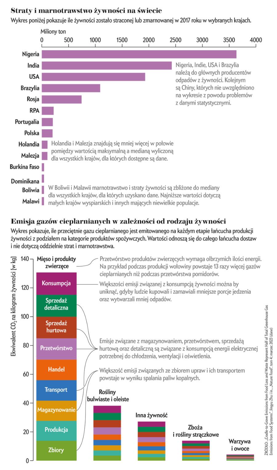Naukowcy stwierdzili, że podczas zbiorów, magazynowania, transportu i konsumpcji marnowała się około jedna trzecia żywności. Obliczyli, że to zmarnowane jedzenie odpowiadało w 2017 roku za emisję 9,3 mld ton dwutlenku węgla – to około połowa całej emisji systemu produkcji żywności. Z tego aż 44,3% przypadało na cztery kraje (Chiny, USA, Indie i Brazylia), co wynikało z ich dużej populacji oraz nawyków żywieniowych. Trzy czwarte emisji, które towarzyszyły produkcji żywności finalnie lądującej w koszu, przypadało na jedną kategorię: mięso i produkty zwierzęce.