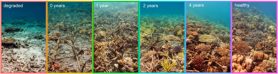 Później dziesiątki ochotników, w tym naukowcy z brytyjskiego University of Exeter oraz z indonezyjskiej National Research and Innovation Agency, zaczęli osadzać na stelażach fragmenty koralowców u wybrzeży indonezyjskiego Celebesu Południowego. I już w ciągu 4 lat (to znacznie szybciej, niż spodziewali się badacze) odzyskano prawidłową ciągłość rafy koralowej. Wykazano również (m.in. dzięki pomiarowi tzw. trajektorii budżetu węglowego), że zregenerowane koralowce mogą skutecznie pełnić swoje funkcje ekosystemowe. Na przykład, stanowić habitat dla wielu morskich organizmów.
