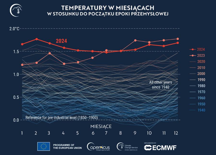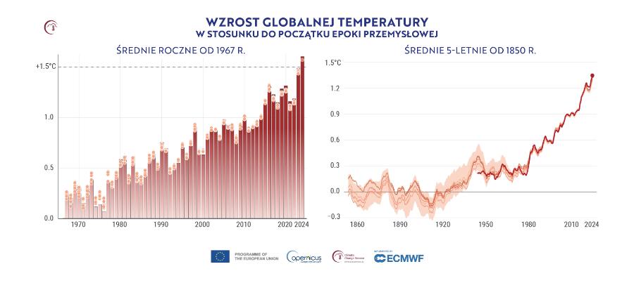 Takiej informacji spodziewano się od początku grudnia, kiedy ogłoszone zostały dane za jedenaście miesięcy ubiegłego roku. Wynikało z nich jednoznacznie, że rekord zostanie pobity. Tak też się stało. W całym 2024 r. średnia temperatura na globie wyniosła 15,1 st. C – podaje opublikowany przez Copernicusa raport. To oznacza, że była aż o 1,6 st. C wyższa od temperatury z początku epoki przemysłowej (dokładnie od średniej z okresu 1850–1900). Tym samym na drugie miejsce zepchnięty został rok 2023, który okazał się chłodniejszy od poprzedniego o 0,12 st. C.