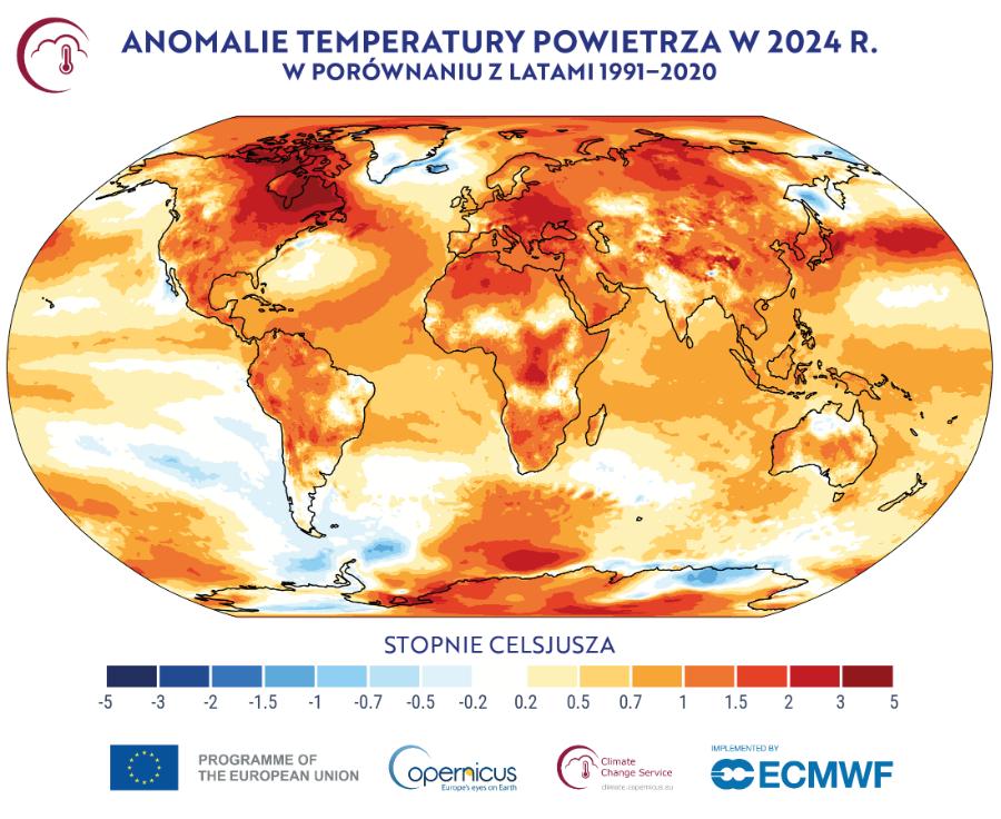 Temperatury dobowe mogą być jednak krótkotrwałymi wyskokami, które nic nie mówią o głównym trendzie klimatycznym. Do jego uchwycenia potrzebne są dane z wielu kolejnych miesięcy i lat. Dlatego wynik za cały 2024 r. robi największe wrażenie po zestawieniu go ze średnią na Ziemi z lat 1991–2020. W porównaniu z tymi trzema dekadami – już przecież wyraźnie cieplejszymi od poprzednich – był on gorętszy aż o 0,72 st. C.