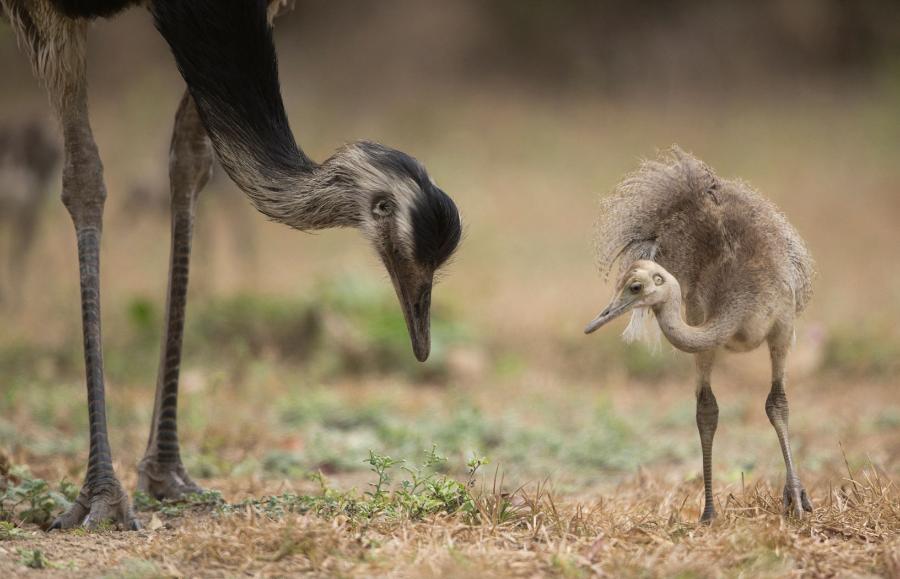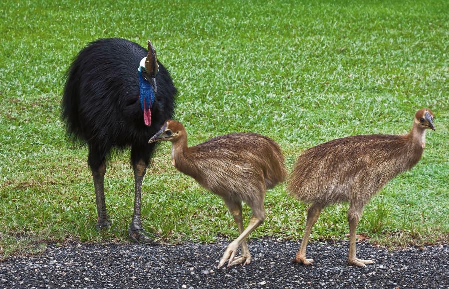 Z kolei samice południowoamerykańskiego nandu w ogóle nie biorą udziału w lęgach. Ograniczają się do zniesienia jaj w miejscu wskazanym przez samca. Ojciec sam na nich siedzi i wodzi pisklęta, nierzadko przeganiając matkę, którą po wykluciu się młodych uważa za zagrożenie. Zdarza się, że po złożeniu pierwszych jaj samiec od razu zaczyna ich wysiadywanie, nie dopuszczając do gniazda żadnych zwierząt, w tym samic ze swojego haremu. Te z kolei zmuszone są składać jaja w pobliżu gniazda, w odległości nie większej niż długość szyi samca. Wysiadujący ojciec może wtoczyć dziobem jaja do gniazda. Podobnie zachowują się kazuary zamieszkujące Australię i Nową Gwineę. Ptaki charakteryzuje czarnobrązowe upierzenie z kolorową głową i szyją. Żyją samotnie i tylko na czas godów łączą się w pary. Samica po złożeniu jaj odchodzi, a samiec przejmuje wszystkie obowiązki rodzicielskie. W tym czasie jest bardzo pobudzony i rzuca się na każde zwierzę, które zbliży się do gniazda lub do młodych. Ptak może poturbować człowieka, a w skrajnych przypadkach nawet go zabić. Niemałe problemy z kazuarami mają ich opiekunowie w ogrodach zoologicznych, gdyż każdy z osobników musi być utrzymywany na osobnym wybiegu. W przeciwnym razie dochodzi do ciągłych walk. Opiekunowie muszą wyczuć moment godów, gdy samicę można połączyć z samcem. Po zniesieniu jaj ptaki ponownie są rozdzielane.