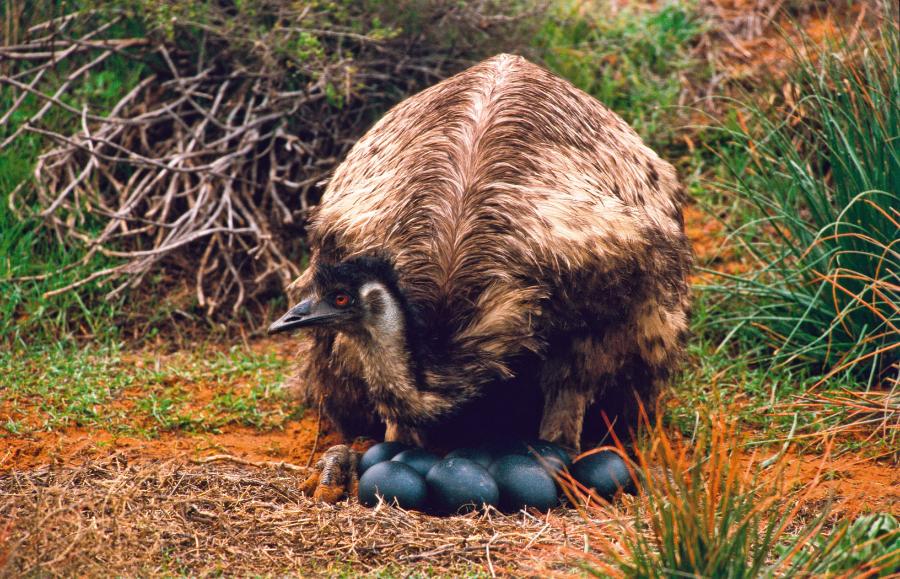 U spokrewnionych z kazuarami emu również samiec odgrywa główną rolę wychowawczą. Początkowo para emu razem buduje gniazdo i nie odstępuje siebie na krok. Ale po złożeniu jaj samica odchodzi, czasami do innego partnera, a wysiadywaniem zajmuje się samiec. Ojciec strzeże jaj jak oka w głowie. Mniej więcej przez 2 mies. inkubacji bardzo rzadko schodzi z gniazda. Sporadycznie pobiera pokarm oraz wodę i prawie w ogóle się nie wypróżnia. Podczas całego tego okresu traci nawet 30% masy ciała. Samiec opiekuje się młodymi nawet do 7 mies. od wyklucia. Chroni je przed niebezpieczeństwem i zimnem oraz uczy, jak zdobywać pokarm.