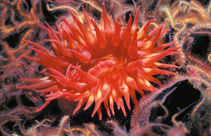 Małże dominują na pierwszych 10–15 m osłony platformy, formując wokół słupów i belek nośnych skorupy o grubości 6–8 cm. Pąkle sięgają jeszcze głębiej. Kiedy organizmy te umierają lub zostają oderwane przez sztormowe fale, spadają do podnóży gigantycznych struktur, tworząc kopce o średnicy kilkudziesięciu metrów i wysokości do 6 m. Wśród kopców rozkładających się muszli oraz na złączeniach stalowych przęseł w środkowej części osłony rodzą się i rozprzestrzeniają młode karmazyny.