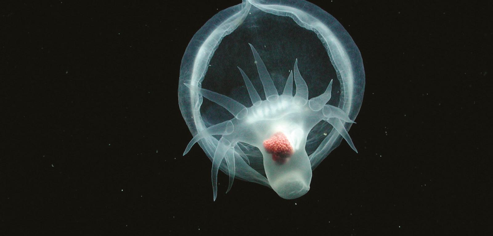 Przez ponad 20 lat naukowcy z kalifornijskiego Monterey Bay Aquarium Research Institute (MBARI) od czasu do czasu natrafiali na to przezroczyste stworzenie, mierzące około 13 cm i obdarzone dziwaczną mieszanką cech. Jego „twarz” otacza przerośnięty kaptur, który służy mu zarówno do chwytania ofiar, jak i do poruszania się przez ruch odrzutowy – niczym meduza. Jego „ogon” jest zakończony frędzlami przypominającymi macki, z których jedną zwierzę morze odrzucić w razie zagrożenia. A gdy zostanie dotknięte, jego kaptur i ogon rozbłyskują niebieskozielonymi punktami, niczym podwodne planetarium.