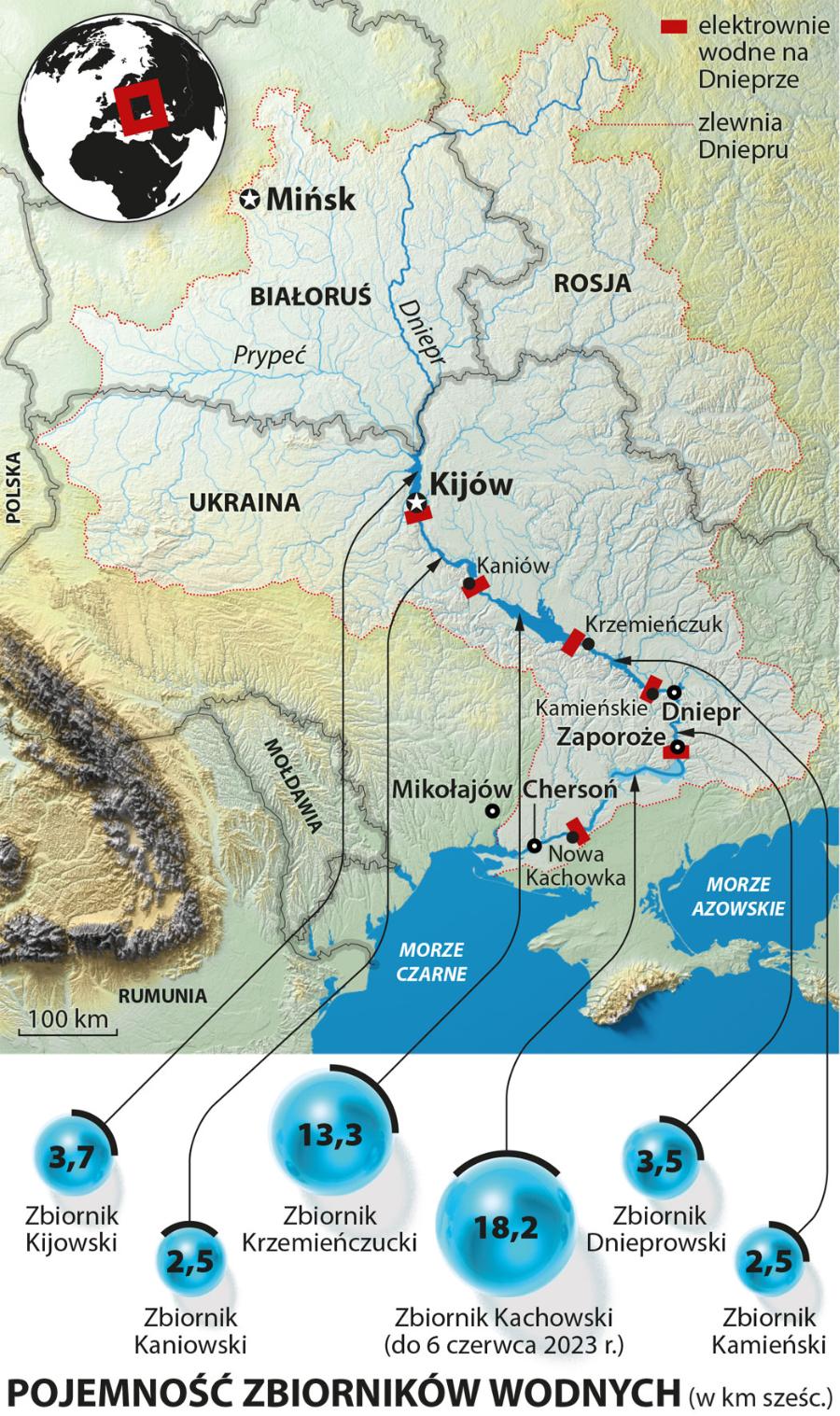 Ładunki eksplodowały w nocy z 5 na 6 czerwca 2023 r. Podłożyli je i zdetonowali najprawdopodobniej Rosjanie. Od 11 miesięcy okupowali tamę tworzącą jeden z najrozleglejszych zbiorników zaporowych w Europie Wschodniej. Powierzchnia lustra wody sięgała 220 tys. ha. To było szóste, ostatnie ogniwo kaskady Dniepru.