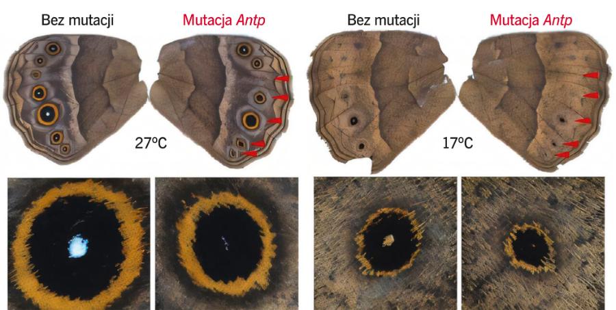 Do zaskakujących wniosków doszli też uczeni z National University of Singapore, badający afrykańskie motyle Bicyclus anynana, znane z kolorowych oczek na skrzydłach. O ich wynikach czytamy na łamach „Nature Ecology & Evolution”. U owadów wyklutych w czasie pory deszczowej plamki są większe, a u tych wyklutych w trakcie pory suchej – mniejsze, co zwiększa szansę na przetrwanie w obu warunkach środowiskowych (zapewniają lepszy kamuflaż). Już wcześniej te różnice wiązano z wpływem temperatury, a teraz okazało się, że odpowiada za nie konkretny gen (Antp), należący do grupy genów kontrolujących rozwój poszczególnych części ciała. Aktywność Antp maleje przy niższych temperaturach, co potwierdza jego rolę w sezonowych zmianach ubarwienia. Modyfikacja nie byłaby możliwa bez specjalnej sekwencji w DNA (tzw. promotora), która działa niczym przełącznik – uaktywniając bądź wyłączając ekspresję (powstawanie białka na podstawie informacji w DNA) Antp. We wcześniejszych badaniach ten sam zespół wykazał też, że za różnice w rozmiarze plamek pomiędzy płciami odpowiada produkowany przez poczwarki steroidowy hormon ekdyzon, który umożliwia ich przemianę w formę dorosłą.