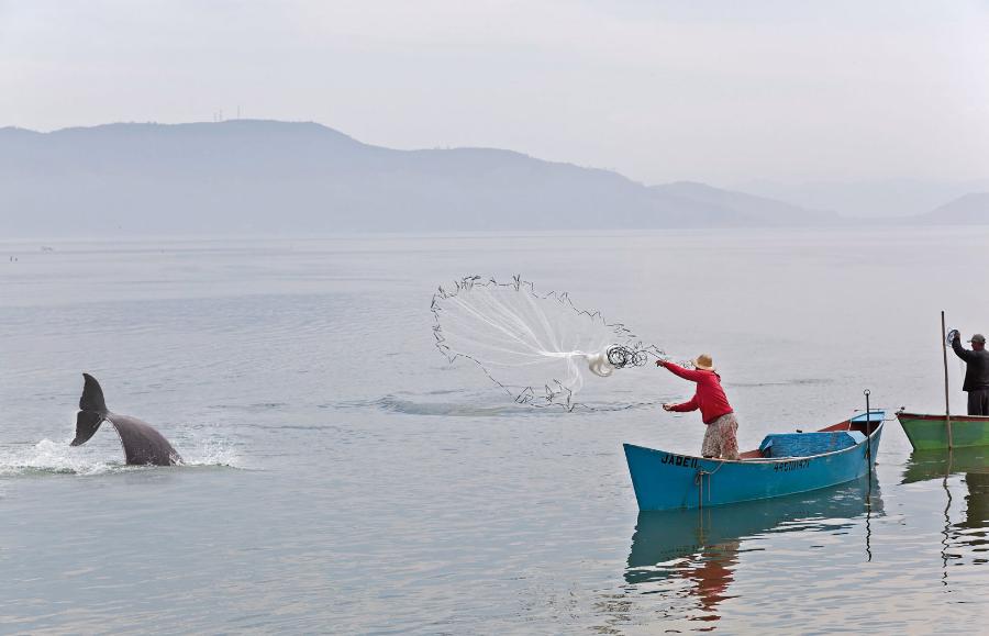 Brazylijskie połowy z butlonosami nie różnią się znacząco od tych z oreczkami. Wspólnie poluje się przeważnie na cefale pospolite. Sieci zarzucane są głównie z brzegu – dzięki temu ludzie łapią większe ryby, a sieci rozbijają ławice, co ułatwia delfinom chwytanie ofiar. Ta współpraca sprawia, że efektywność połowu zwiększa się nawet siedmiokrotnie – bez pomocy butlonosów ludzie zarzucaliby sieci w przypadkowe miejsca. Pomoc polega na tym, że delfiny sygnalizują rybakom, gdzie i kiedy warto umieścić sieć poprzez... skinienie głową. Zwierzęta wystawiają głowę nad wodę i uderzają o jej powierzchnię, zginając szyję.