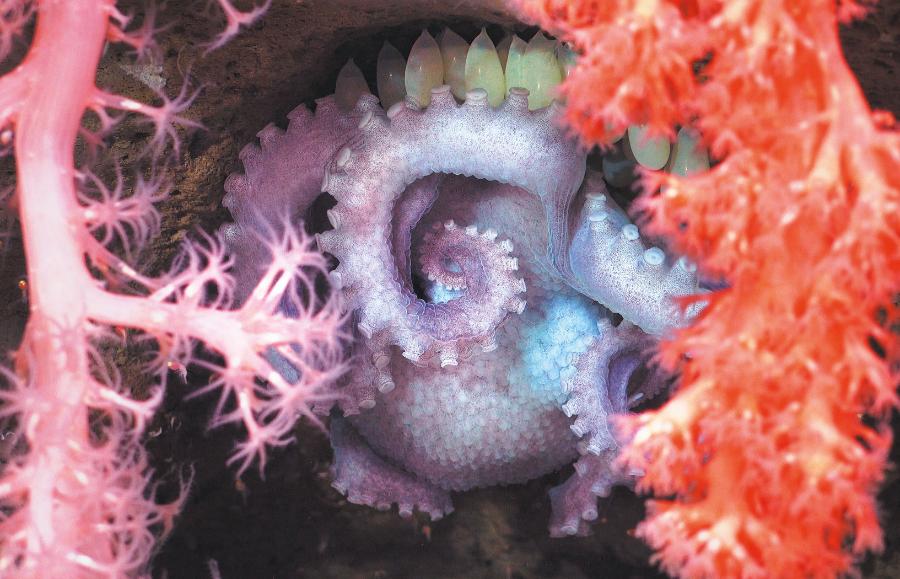 Celem wyprawy było stworzenie bazowego katalogu życia zamieszkującego kanion. Gdy robot zszedł na dno, naukowcy zobaczyli coś w rodzaju głębinowego „królestwa Barbie”: ośmiornica obejmująca swoje jaja chroniła się za różowymi i pomarańczowymi koralowcami (u góry po prawej); rumiane homary dreptały w zwartym szyku po dnie, kolczaste, szkarłatne kraby przemykały między nimi, a karminowy żebropław mienił się bioluminescencją. Na ścianach kanionu tkwiły brzoskwiniowe koralowce – prawdopodobnie nieznany jeszcze gatunek.