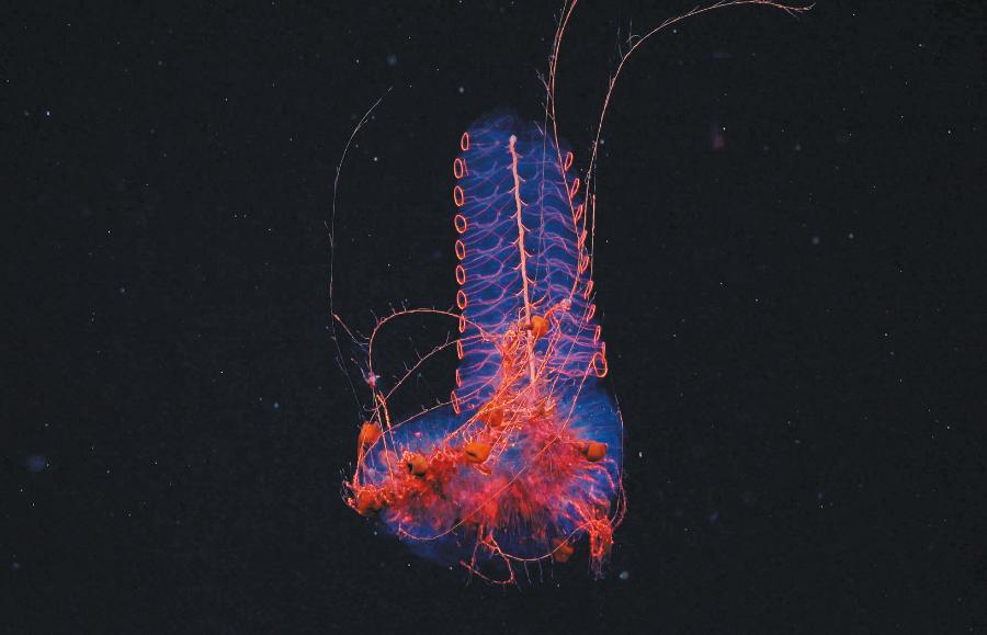 Dwie mile pod powierzchnią oceanu, u wybrzeży Argentyny, rozciąga się wąwóz niemal dwa razy głębszy niż Wielki Kanion. Dno tej podmorskiej przepaści roi się od stworzeń wyglądających jak uczestnicy kosmicznego karnawału – jest wśród nich przezroczysta kałamarnica z rogopodobnym wachlarzem ramion (u góry po lewej), bladoróżowe homary, powolny krab królewski obwieszony setką przyczepionych do niego pąkli oraz misternie zbudowany, unoszący się w toni syfonofor (u dołu po prawej).