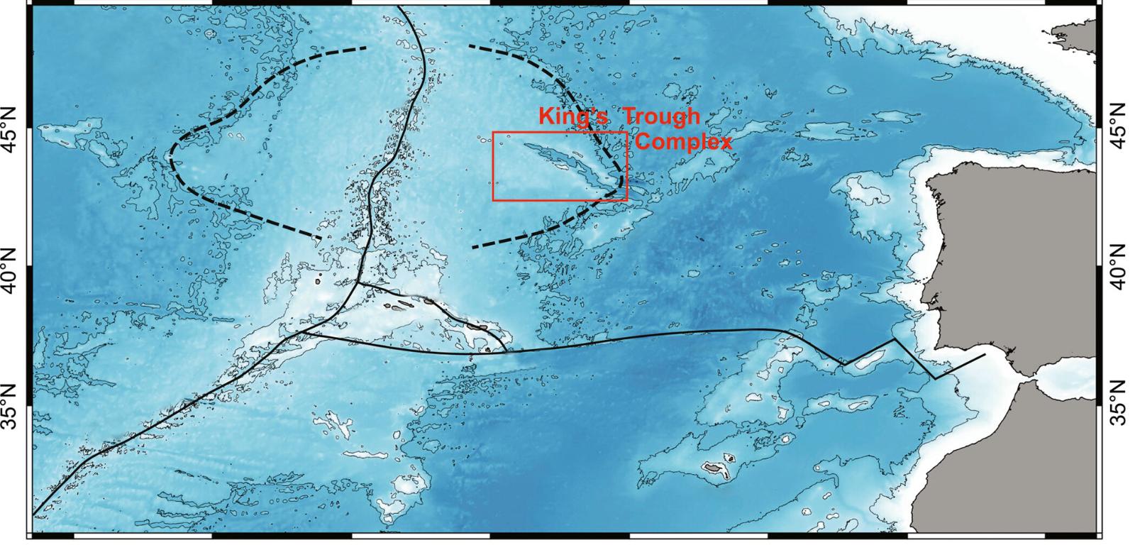 King’s Trough Complex znajduje się mniej więcej na wysokości północnej Hiszpanii, w odległości ok. 1000 km od jej brzegów. Rozmiarami przewyższa Wielki Kanion Kolorado, ma bowiem 3 km głębokości i ok. 500 km długości.