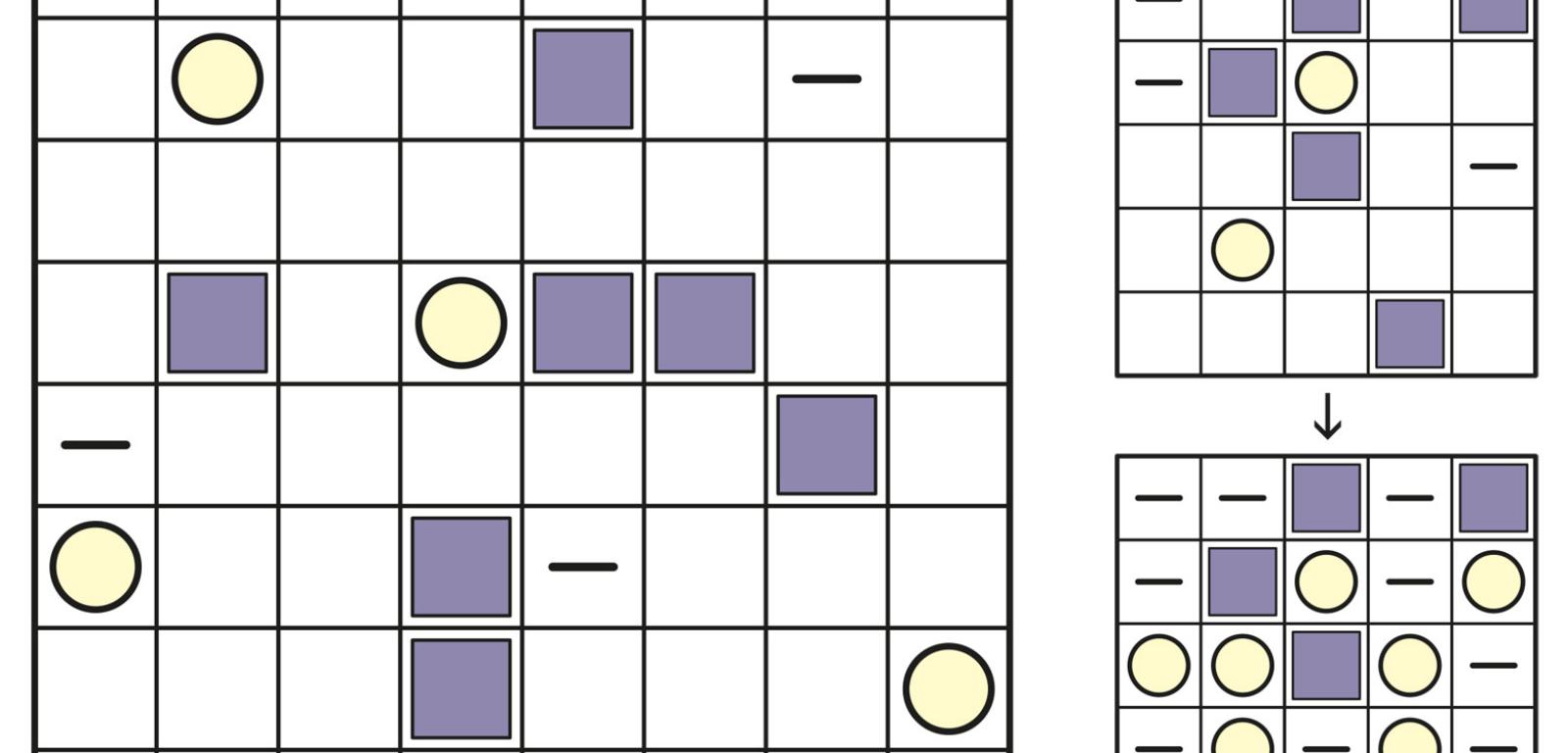 W każdej białej kratce powinno znaleźć się kółko lub kreska. Należy je rozmieścić tak, aby w żadnym wierszu, kolumnie ani w żadnej linii ukośnej wzdłuż przekątnych pól trzy kolejne znaki nie były takie same.