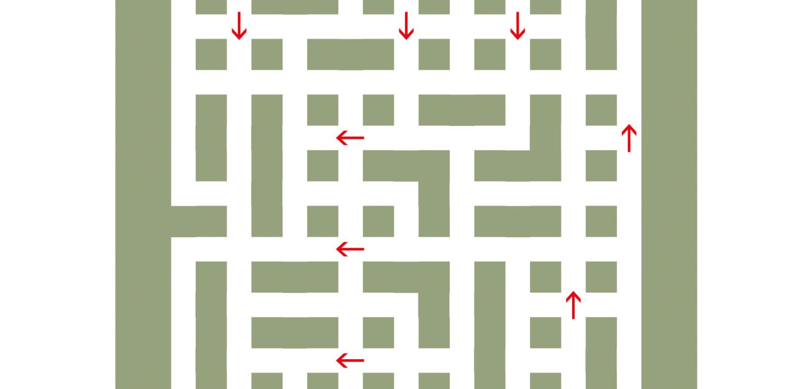 Narysuj trasę przejazdu przez sieć ulic – od wjazdu w lewym dolnym rogu do wyjazdu w prawym górnym. Trasa powinna przechodzić przez wszystkie skrzyżowania ze strzałkami – zawsze zgodnie z kierunkiem wskazanym przez strzałkę.