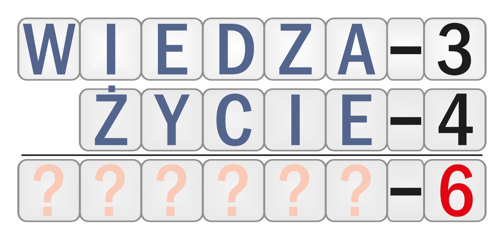 Do odgadnięcia jest sekretne słowo (znany rzeczownik pospolity w pierwszym przypadku liczby pojedynczej) złożone z sześciu różnych liter. Kluczem do tego są dwa wyrazy pomocnicze i liczba umieszczona obok każdego z nich. Liczba oznacza, ile liter sekretnego słowa znajduje się w wyrazie pomocniczym. Sekretne słowo nie zawiera innych liter niż te, które są w wyrazach pomocniczych.