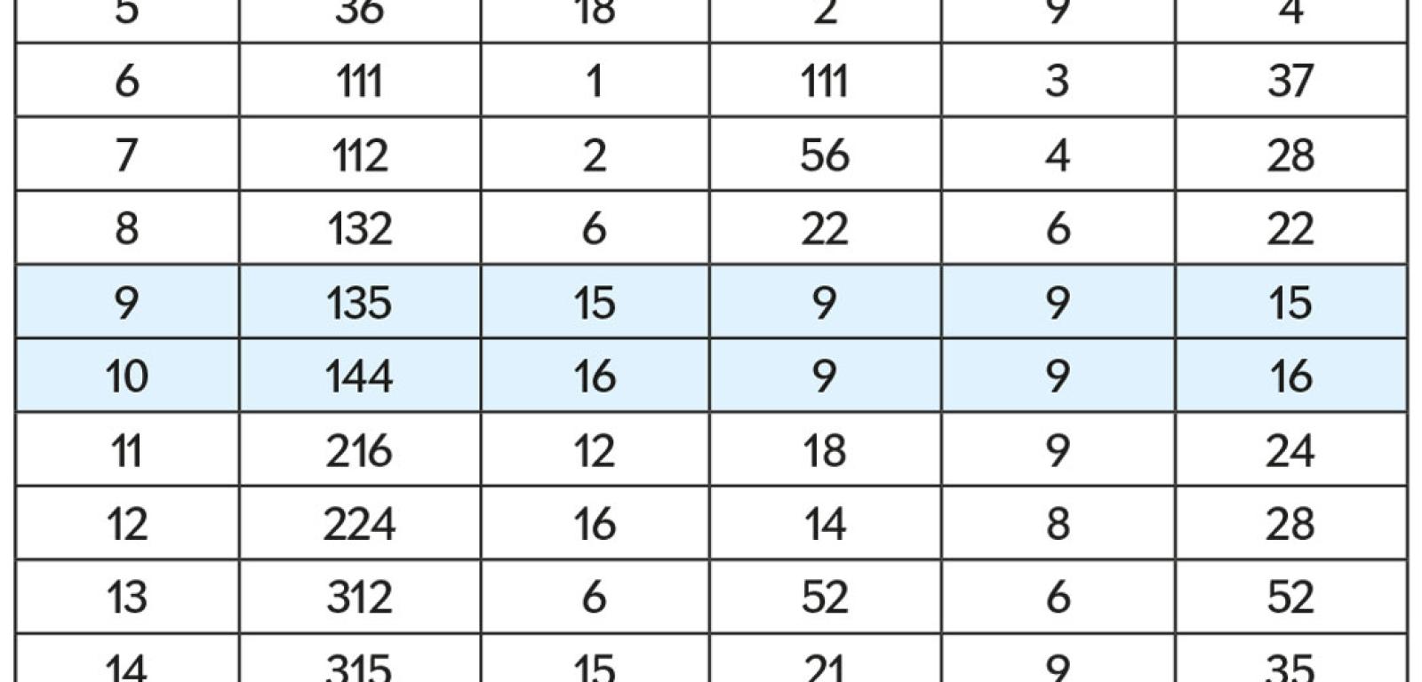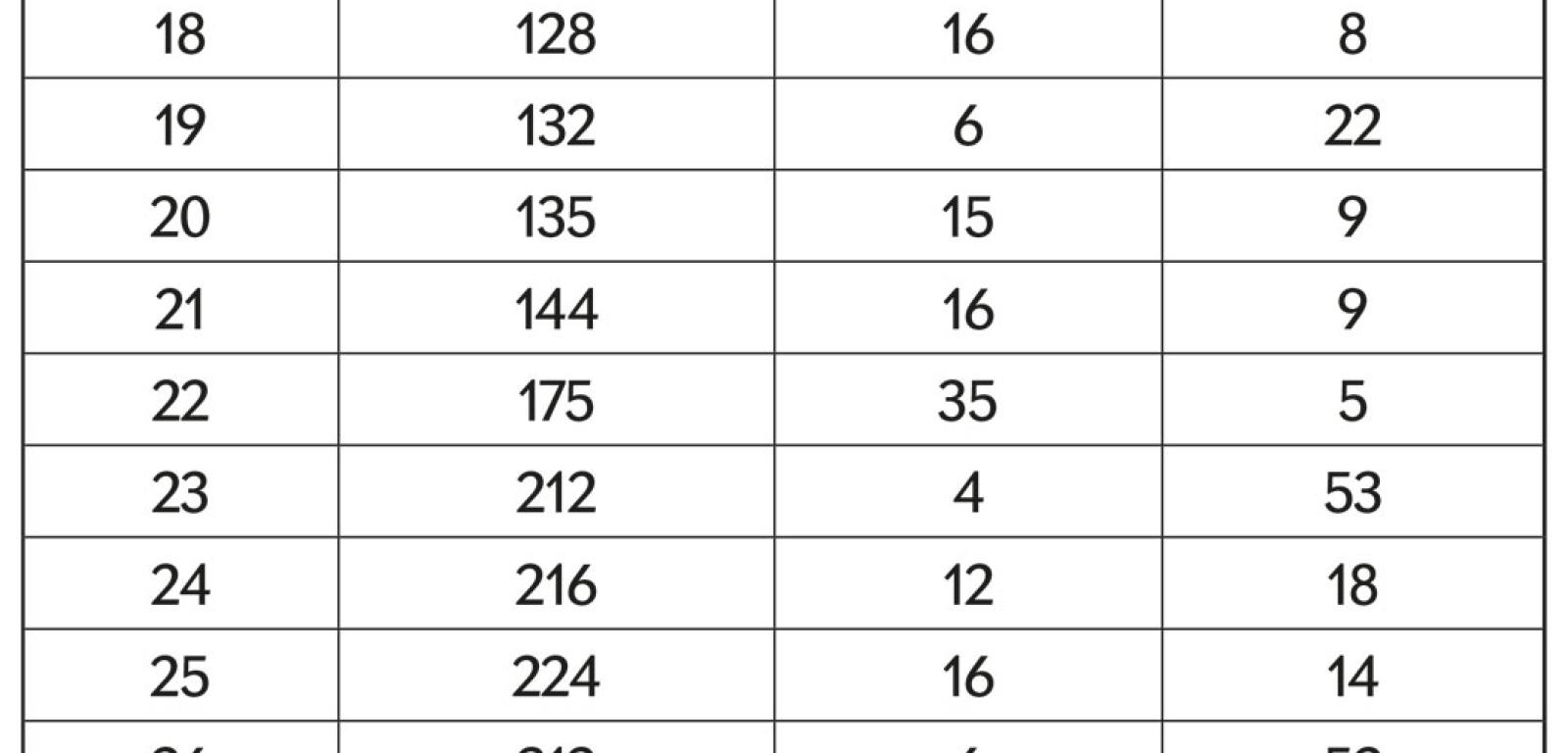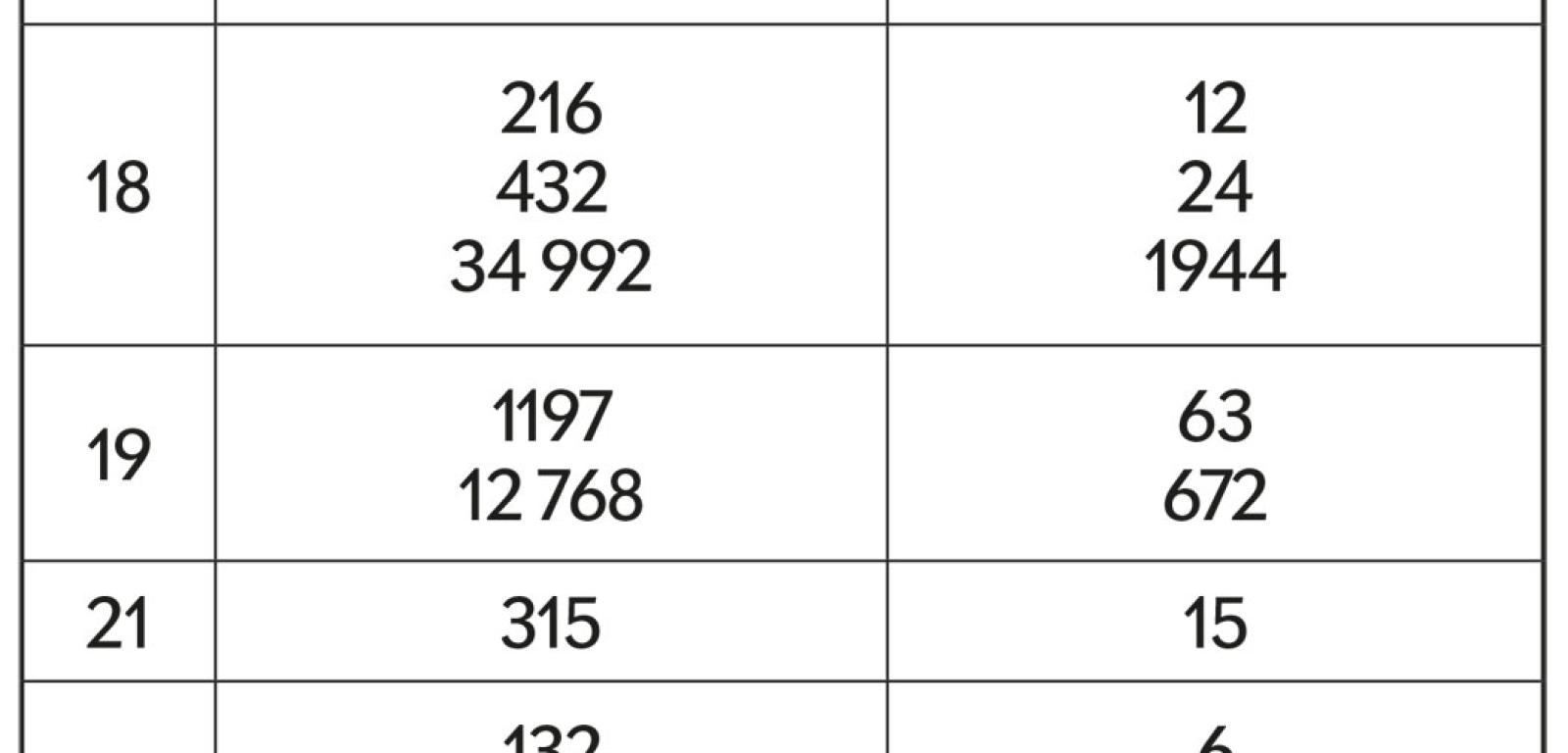 W tabeli 2 podane są: w pierwszej kolumnie ilorazy QZ w zakresie do 50; w drugiej liczby Z, po których podzieleniu przez iloczyn ich cyfr (trzecia kolumna) powstaje dany iloraz. Do QZ=30 podane są wszystkie liczby Z, dalej tylko najmniejsze, które i tak są niemałe. Jak widać, niektórych ilorazów brakuje, ponieważ nie ma liczb Z, które by je generowały. Takimi brakami są oczywiście wszystkie ilorazy zakończone zerem, a ponadto tworzące ciąg, którego początek stanowią pominięte w tabeli: 15, 16, 24, 25, 26, 32, 35, 38, 39, 42, 43, 47, … . Inaczej mówiąc, nie ma na przykład takiej liczby X, która pomnożona przez 16 dałaby liczbę, której iloczyn cyfr byłby równy X. Próbując taką znaleźć, można jednak trafić bardzo blisko celu, wybierając X=159, bowiem 159×16=2544, a 2×5×4×4=160, czyli X+1.