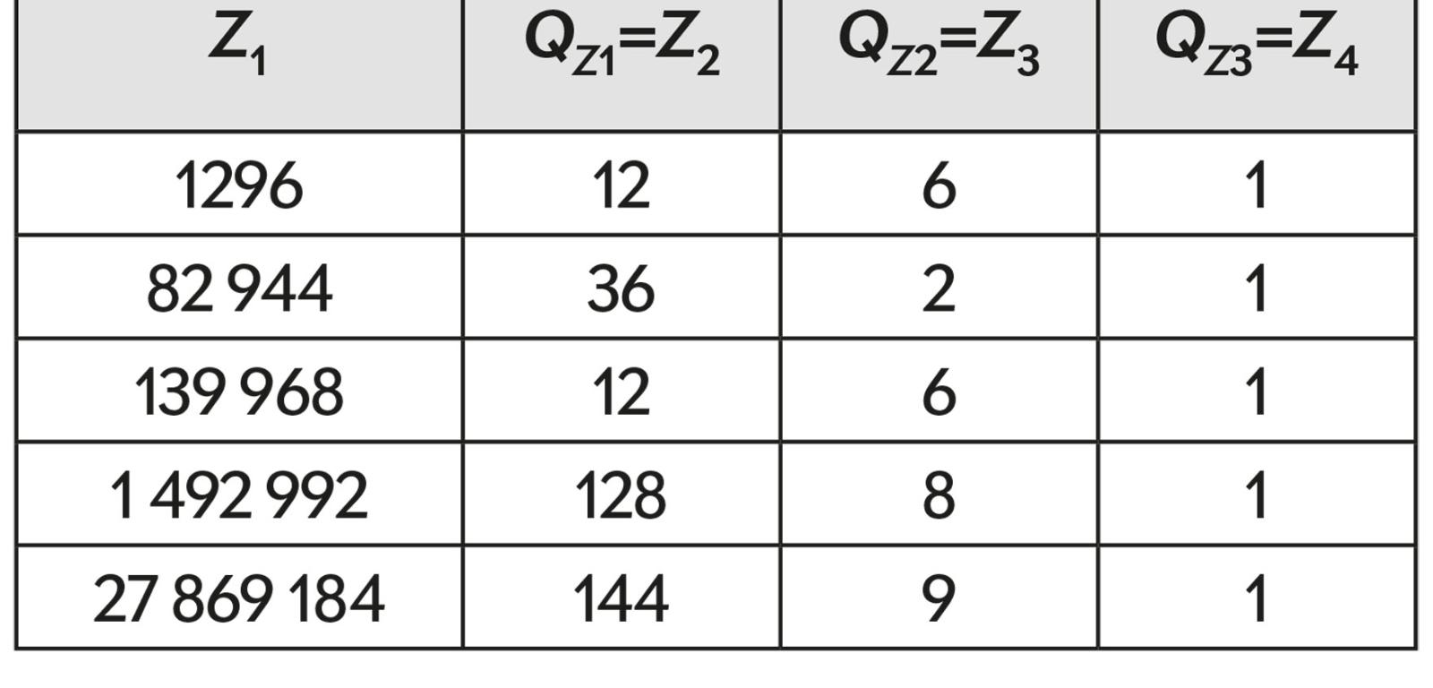 Wszystkie jedno- i dwucyfrowe liczby Z oraz wszystkie „jedynkowe” mają tę własność, że generują ilorazy, które są mniejszymi liczbami Z. Cecha ta jest właściwa także niektórym innym liczbom, a kilka zachowuje ją do trzeciego „pokolenia”. Takich wytrwałych w generowaniu Z liczb Z jest pięć. Wszystkie one oraz trzy etapy działania każdej przedstawione są w tabeli 3.