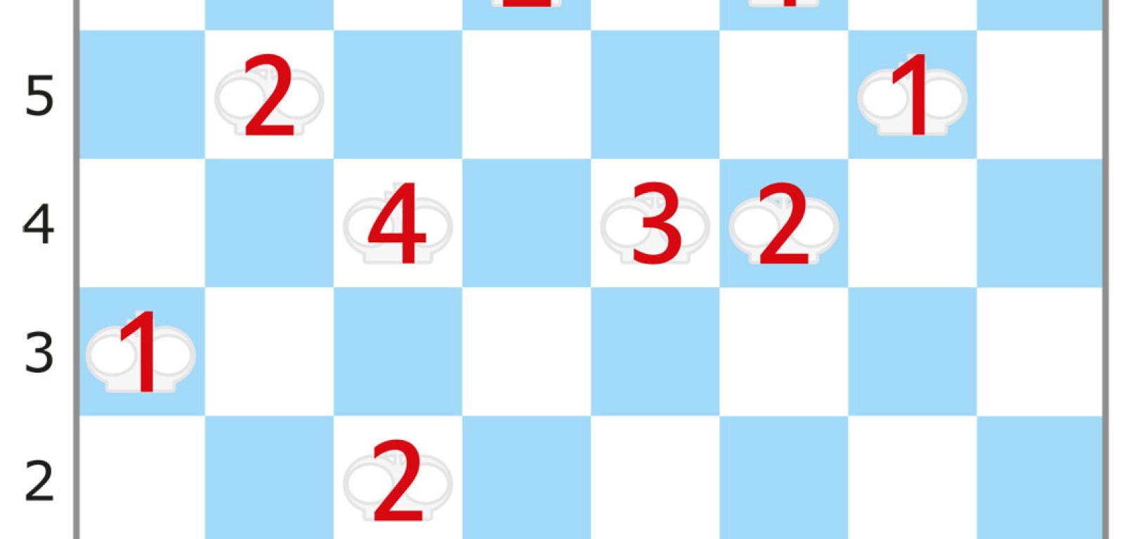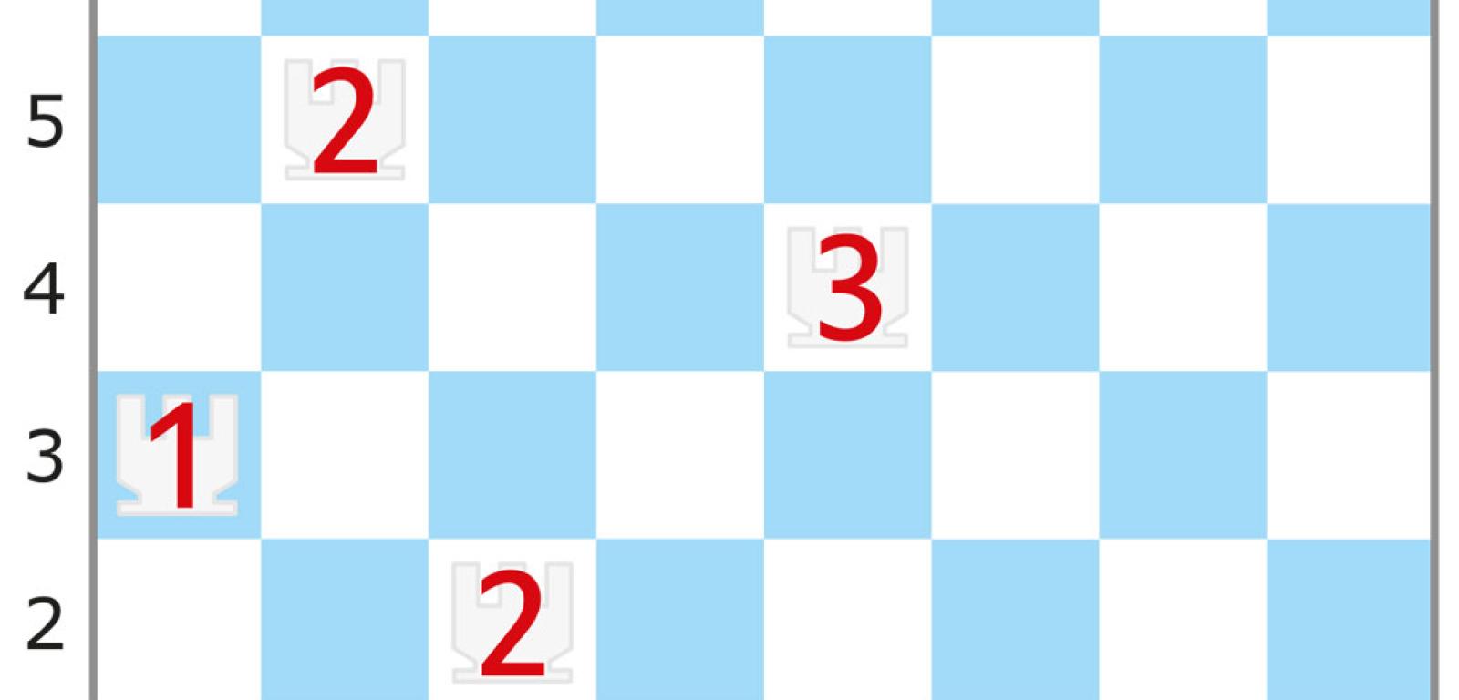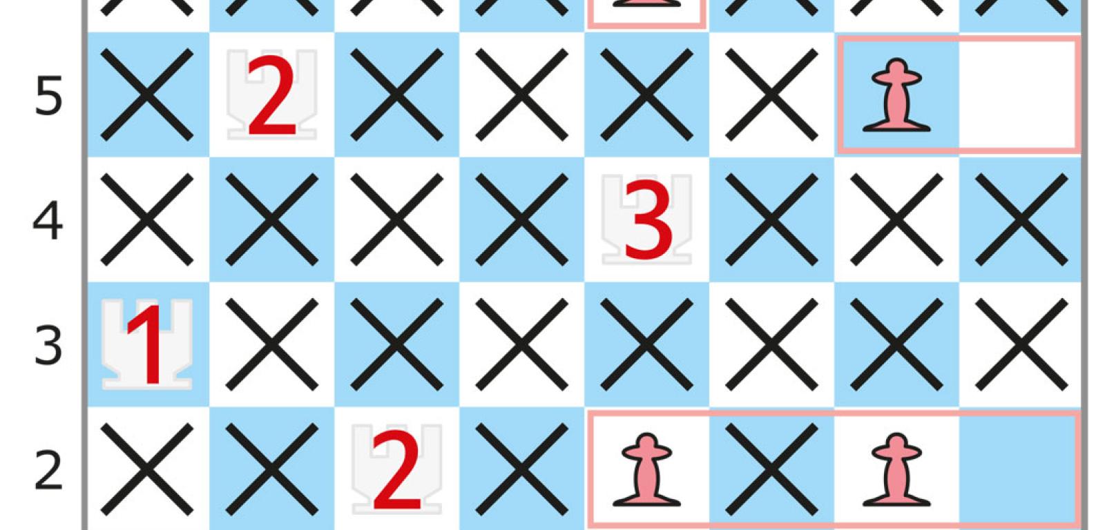 Na tej samej imprezie debiutowało podobne zadanie, które także można przenieść na szachownicę, a w konkretnym przypadku wystarczy nieco zmodyfikować sytuację z rys. 1: usuwamy siedem króli z cyframi, a pięć pozostałych zastępujemy wieżami, nie zmieniając cyfr (rys. 2). Teraz także chodzi o wskazanie pozycji pionków – w tym przypadku nie wiadomo, ilu – z których każdy atakowany jest przez co najmniej jedną wieżę. Liczba na wieży oznacza, ile pionków jest przez nią atakowanych. Należy jednak uwzględnić drobne odstępstwo od reguł szachowych: wieża atakuje każdy pionek stojący w rzędach (wierszu i kolumnie), na których przecięciu się znajduje, a więc także taki, który jest zasłonięty przez inny pionek. Ponadto obowiązuje dodatkowy warunek: musi być zachowany dystans, czyli żadne dwie bierki – wieża i pionek lub dwa pionki – nie mogą znajdować się na sąsiednich polach, także stykających się tylko rogiem. W oryginale wieże są latarniami morskimi, a pionki oświetlanymi przez nie statkami zakotwiczonymi na polach diagramu-akwenu.