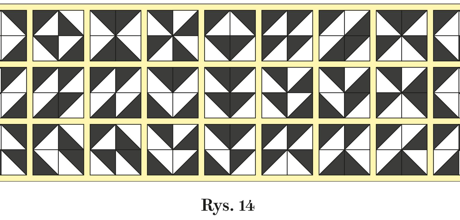 1. Układając z płytek Trucheta kwadrat 2x2 można utworzyć 27 różnych wzorów – przy założeniu, że za jednakowe uznajemy dwa, z których jeden powstaje z drugiego w wyniku obrotu, lustrzanego odbicia lub zmiany negatyw-pozytyw. Wszystkie wzory na rys. 14