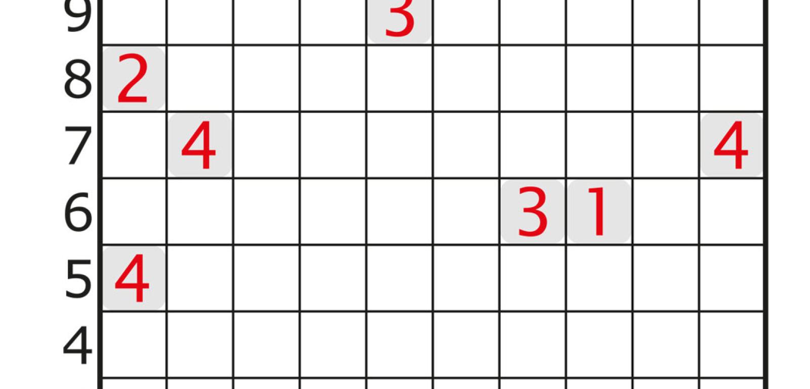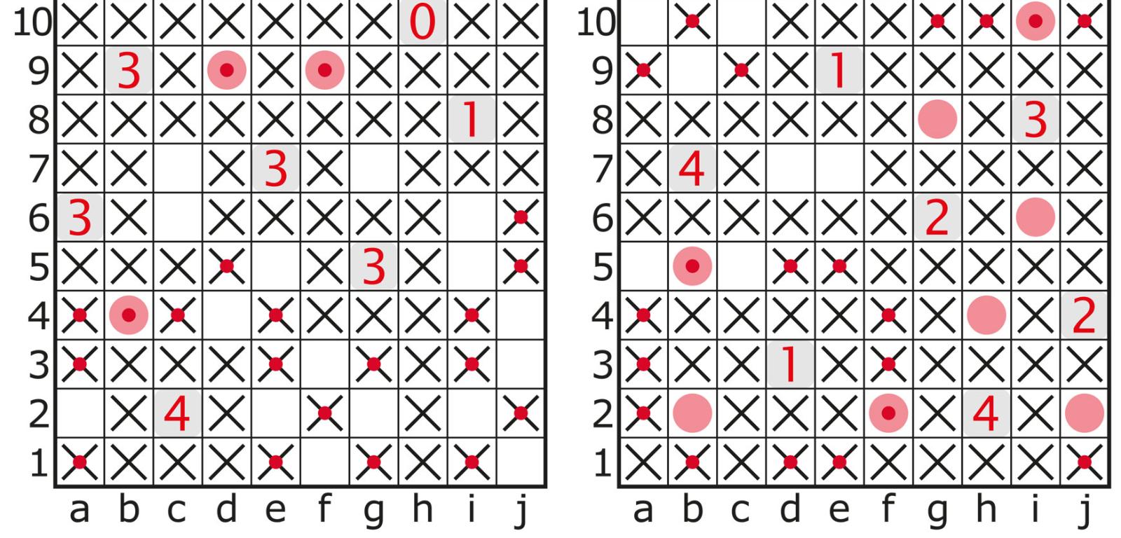 wynika, że x=3, y =7. Zatem na rys. 8 w każdym diagramie tylko w trzech polach z czerwonymi kropkami pojawią się statki. Na rys. 8a te trzy pola ujawniane są natychmiast jako pewniaki (b4, d9, f9), zatem pozostałe pola z kropkami można przekreślić (rys. 9a). Dalsza droga do celu jest bardzo prosta, a zaczyna się od obsadzenia statkami kratek a2, c6, i6.