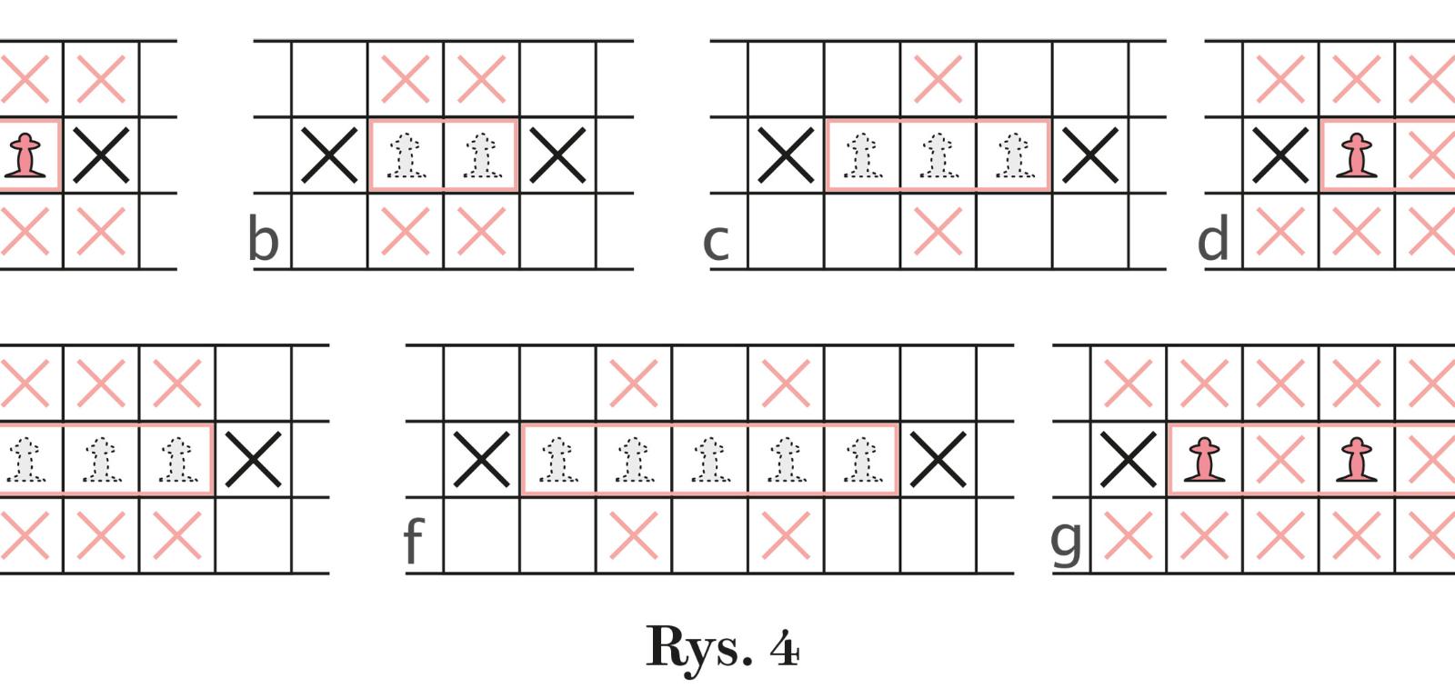 Na rys. 4 znajdują się pasy złożone z 1≤p≤5 pól, a w każdym z nich powinien pojawić się przynajmniej jeden pionek. Jeśli p=1, to pionek obsadza jedyne pole, a w sąsiednich pasach znikają po trzy pola (a). Gdy p=2, to na razie nie wiadomo, na którym polu zagości pionek, ale niezależnie od tego, gdzie się znajdzie, można wykreślić po dwa pola z sąsiednich rzędów (b). Dla p=3 sytuacja jest podobna, jeżeli na przydział pola czeka tylko jeden pionek. Wtedy w każdym sąsiednim pasie do wykreślenia będzie jedno pole – sąsiednie względem każdego z trzech pól oferowanych pionkowi (c). Jeżeli jednak w tym pasie muszą się znaleźć dwa pionki, to ich ulokowanie jest jednoznaczne, a w sąsiednich pasach ubywa po pięć pól (d). Przy p=4 i obecności tylko jednego pionka nic się nie da zrobić, ale jeśli na miejsce czekają dwa, to rezultatem będzie wykreślenie czterech pól w obu sąsiednich pasach (e). Wreszcie gdy p=5, to sytuacja ulega niewielkiej zmianie, gdy na przydział czekają dwa pionki (f), albo radykalnej, gdy są trzy – wtedy meldują się wszystkie i wykreślonych zostaje po siedem pól w sąsiednich pasach (g). Analizując coraz dłuższe pasy, łatwo ustalić, że największa liczba pionków kp, które można umieścić w pasie złożonym z p pól równa jest liczbie liczb nieparzystych w zbiorze p początkowych liczb całkowitych dodatnich. Liczby kp tworzą więc ciąg: 1, 1, 2, 2, 3, 3, 4, 4, 5, 5, … , czyli kp=?p/2? – nawiasy kwadratowe bez dolnej kreseczki oznaczają tzw. sufit, tzn. konieczność zaokrąglenia liczby w nawiasach w górę, jeżeli nie jest całkowita.