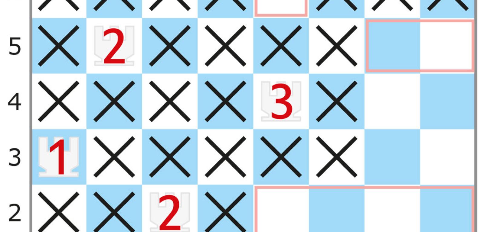 Zadanie królewskie (rys. 1) w pierwszej chwili może się wydać trudne, bo na początku brak „pewniaków”, czyli pól, w których powinien pojawić się jakiś pionek. Jeśli jednak wpaść na właściwą metodę (warto spróbować), rozwiązywanie okaże się całkiem proste. Takie zadania w wersji minerskiej są dość popularne, zwłaszcza że ich protoplastą jest klasyczna gra komputerowa saper z roku 1989. Natomiast łamigłówki wieżowo-latarniowe są mniej znane, zajmiemy się więc nieco bliżej kulisami ich rozwiązywania.