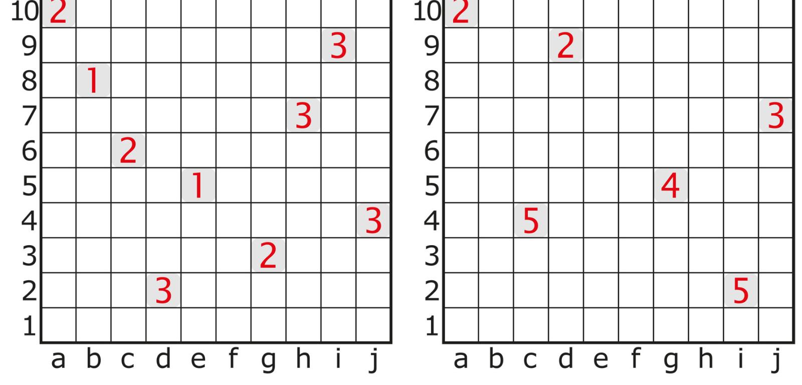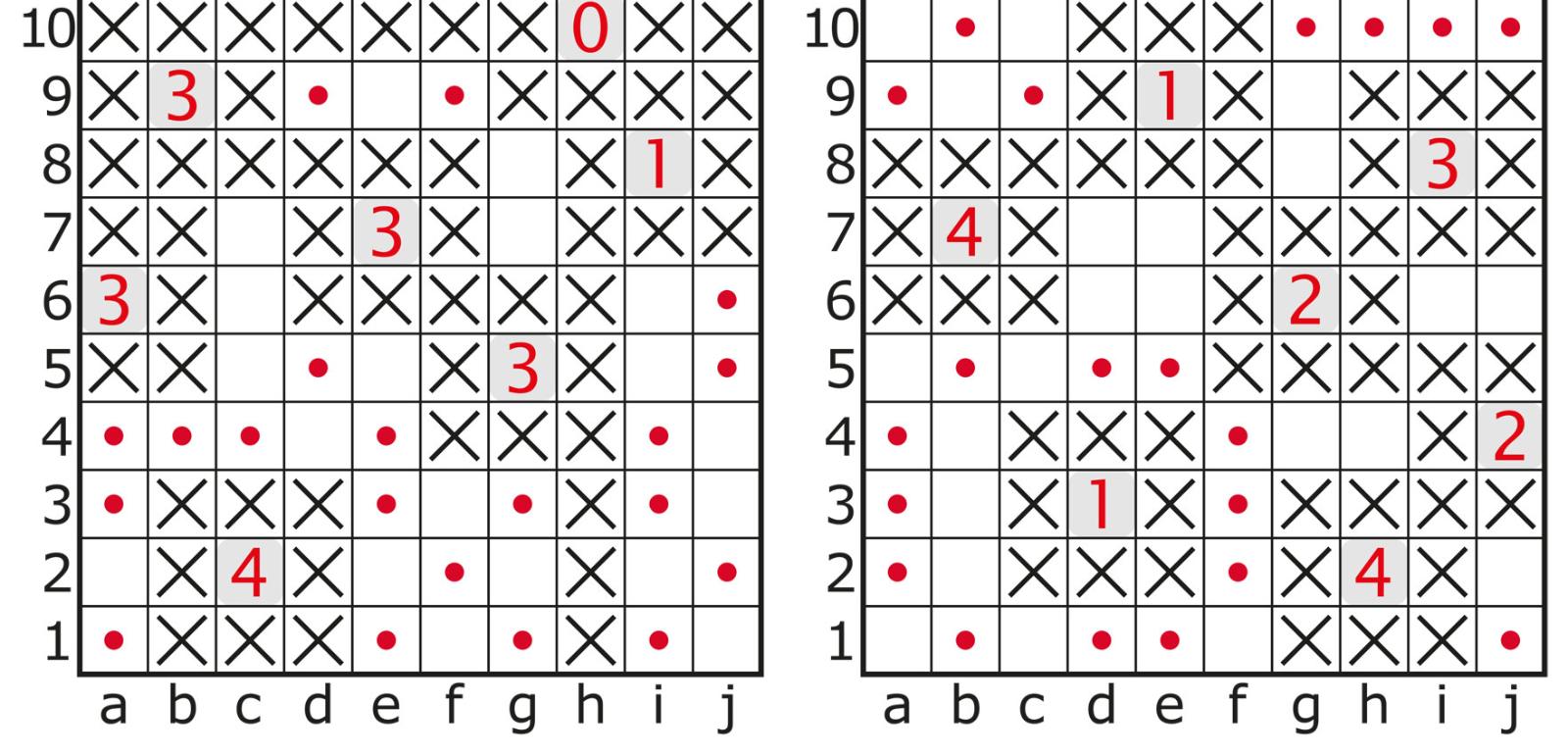 Na brneńskich Mistrzostwach były dwa zadania (rys. 8) – oba z dwoma warunkami. Potem okazało się jednak, że wystarczyłby jeden: każdy diagram zawiera 10 statków. To kluczowa, konieczna i dostateczna informacja, umożliwiająca zastosowanie w obu zadaniach prostej logiczno-rachunkowej metody rozwiązywania. Na rys. 8 są już wstępne oznaczenia: krzyżyki w polach, które nie mogą zawierać statków, czerwone kropki w polach oświetlanych tylko przez jedną latarnię.