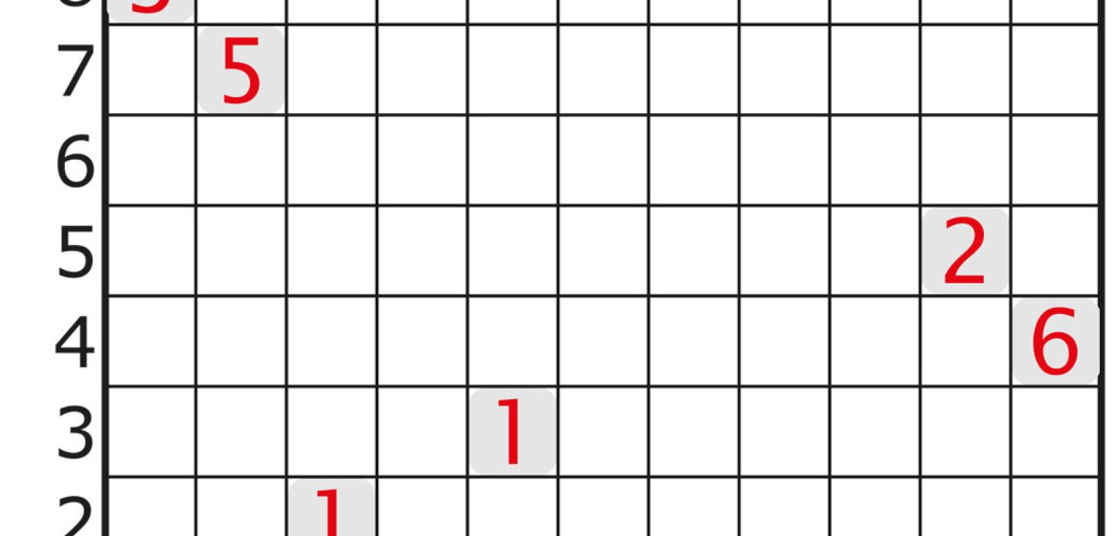 2. Dotychczas każdy statek zajmował jedną kratkę, czyli był – zgodnie z nazwą przyjętą w grze w bitwę morską – 1-masztowcem. Tym razem flota składa się z różnych statków, także 2- i 3-masztowców. Wszystkich jest 10 umieszczonych pod akwenem (rys. 12), na którym należy je rozmieścić zgodnie ze standardowymi regułami, a więc statki powinny zachowywać dystans między sobą i latarniami. Liczba oznacza, ile segmentów statków oświetla dana latarnia. Jeśli w tym samym rzędzie stoją dwie latarnie, to żadna nie blokuje światła drugiej, czyli każda sięga okrętu swoim światłem tak, jakby stała w rzędzie sama. Gwoli jasności nad diagramem znajduje się mini-przykład. W rozwiązaniu wystarczy podać pozycje (współrzędne) czterech 1-masztowców.