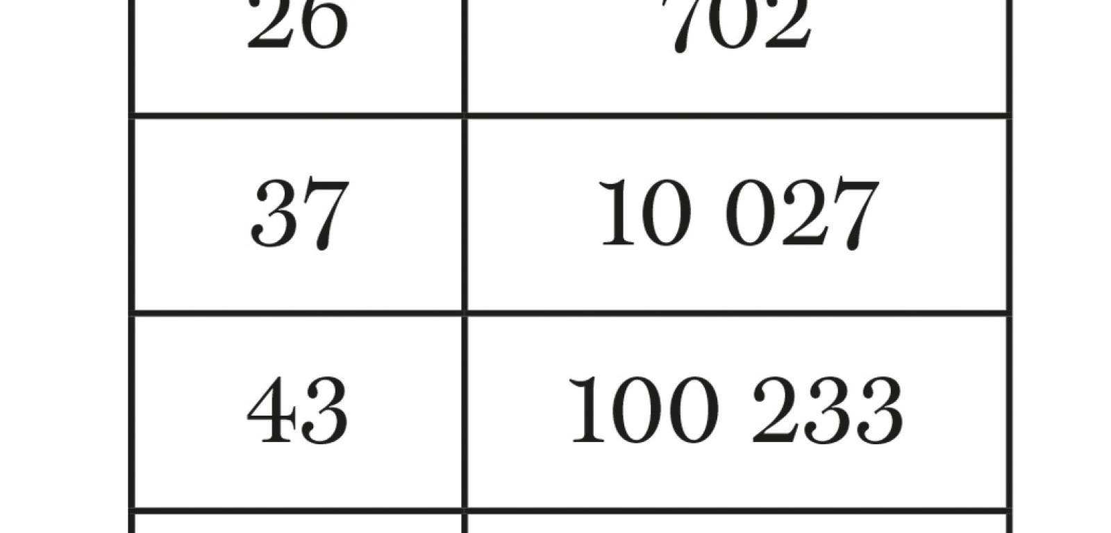 Zdecydowana większość najmniejszych rozwiązań X dla różnych k to liczby giganty. Wspomniana 58-cyfrowa dla k=6 jest maluchem przy k=38 (X liczy 378 cyfr) lub k=102 (1018-cyfrowe X). Rozwiązania nie dłuższe niż 6-cyfrowe są w tym gronie jak rodzynki w cieście. Poza „sztampowymi” dla k=10m (X=10m, X’=1) oraz już wymienionym 102 564 (k=4) takich rarytasów jest tylko osiem (tab. 2).