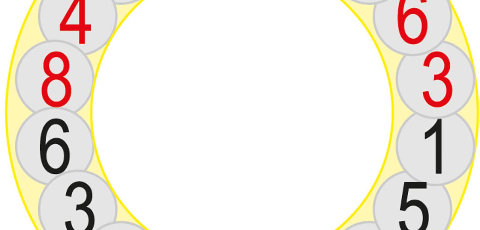 Warto zwrócić uwagę, że w tabeli 1 trzy pary liczb X – dla b=1 i 4, 3 i 9 oraz 5 i 8 – są względem siebie koliste, czyli po zapisaniu jednej równomiernie na okręgu można z tego okręgu odczytać drugą liczbę z tej samej pary, zaczynając od innej cyfry. Co ciekawe, „totalna” kolistość występuje w rozwiązaniu dla k=2. Wtedy najkrótszych 18-cyfrowych rozwiązań jest dziewięć i wszystkie można zapisać w postaci pierścienia złożonego z 18 cyfr-ogniw (rys. 1). Każde rozwiązanie zaczyna się od czerwonej cyfry i odczytywane jest wokół pierścienia zgodnie z ruchem wskazówek zegara – aż do zaliczenia kompletu cyfr. Najmniejsze to 105263157894736842 – po przeniesieniu jedynki na koniec i usunięciu początkowego zera powstaje liczba dwukrotnie mniejsza.
