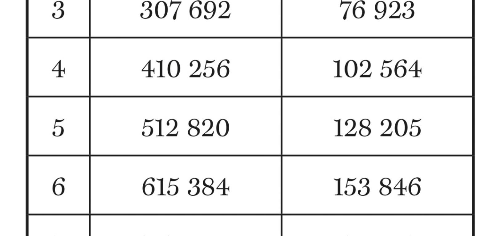 Stąd do rozwiązania dla k=4 jest już bardzo blisko. Wystarczy znaleźć najmniejsze b, dla którego 10a będzie przynajmniej 5-cyfrowe. Tak jest już dla b=1; wówczas a=2564, X=105+2564=102564, X’=25641. Dla b=2 a=5128, X=2×105+5128=205 128, X’=51 282. Od b=4 zaczynają się 6-cyfrowe wartości X’, odpowiadające podanym w tabeli 1 wartościom X, które są wielokrotnościami najmniejszego X.