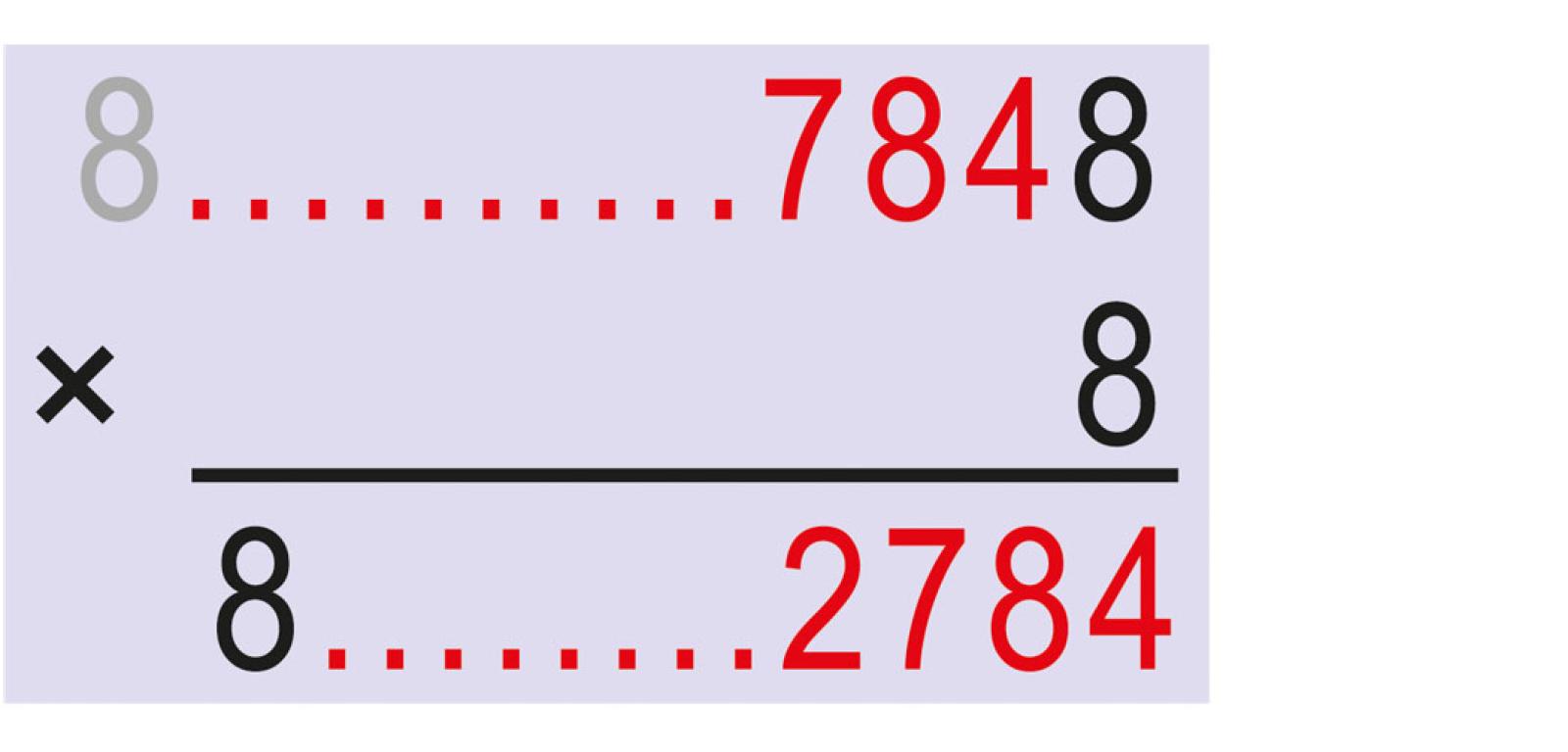 Po takim uściśleniu rozwiązywanie dla danego k staje się automatyczne, choć zwykle bardzo żmudne. Sprowadza się bowiem do odtwarzania mnożenia, w którym mnożnik, ostatnia cyfra mnożnej i pierwsza cyfra iloczynu są równe k (na rys. 2 k=8), a rząd kropek w mnożnej i iloczynie oznacza ten sam ciąg cyfr. Obliczane od końca cyfry iloczynu są przenoszone do mnożnej, by działanie mogło być kontynuowane na zasadzie przypominającej sprzężenie zwrotne (rys. 2b). Koniec rekonstrukcji następuje w momencie, gdy na początku mnożnej pojawia się „wolna” ósemka, czyli niebędąca jednostką liczby dwucyfrowej (rys. 2c). Rozwiązaniem, czyli liczbą X, jest oczywiście iloczyn. Najmniejsze X łatwo wskazać w tabeli 1.