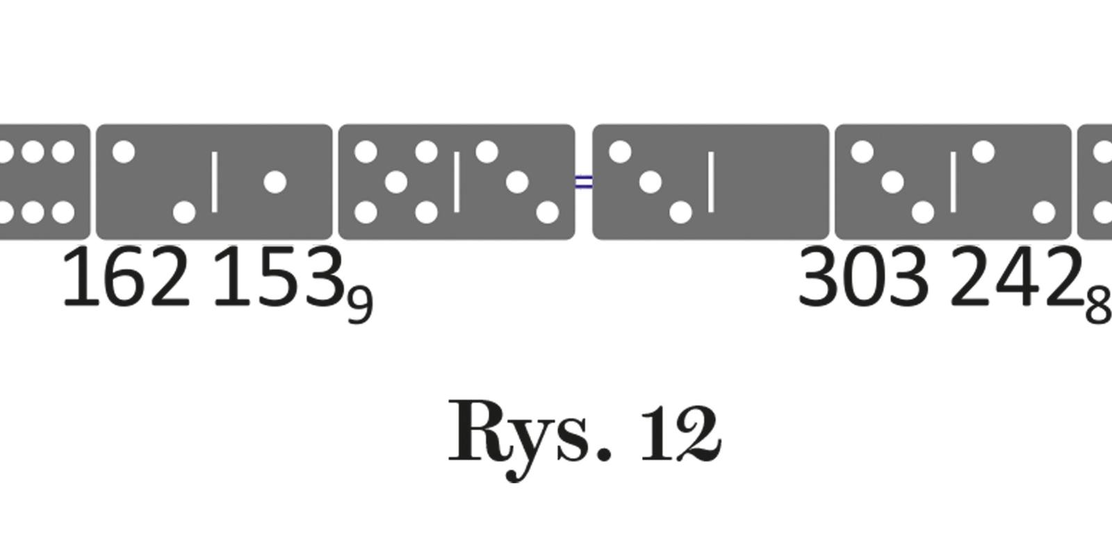 3. 100002 wydaje się najmniejszą liczbą ułożoną z trzech kamieni domina taką, że jej zapisy w systemach liczbowych dziewiątkowym, ósemkowym i siódemkowym także można ułożyć z domina – każdy z trzech kamieni (rys. 12). Co istotne: każdy z tuzina kamieni użytych do ułożenia tych czterech liczb jest inny. „Wydaje się”, ponieważ jeśli przyjąć, że liczby mogą zaczynać się zerem, czyli pustą połówką kamienia (mydłem), to liczba w układzie dziesiętnym (a więc także każda z trzech pozostałych) może być mniejsza. Jaka będzie najmniejsza przy zachowaniu warunku, aby żaden kamień się nie powtarzał?