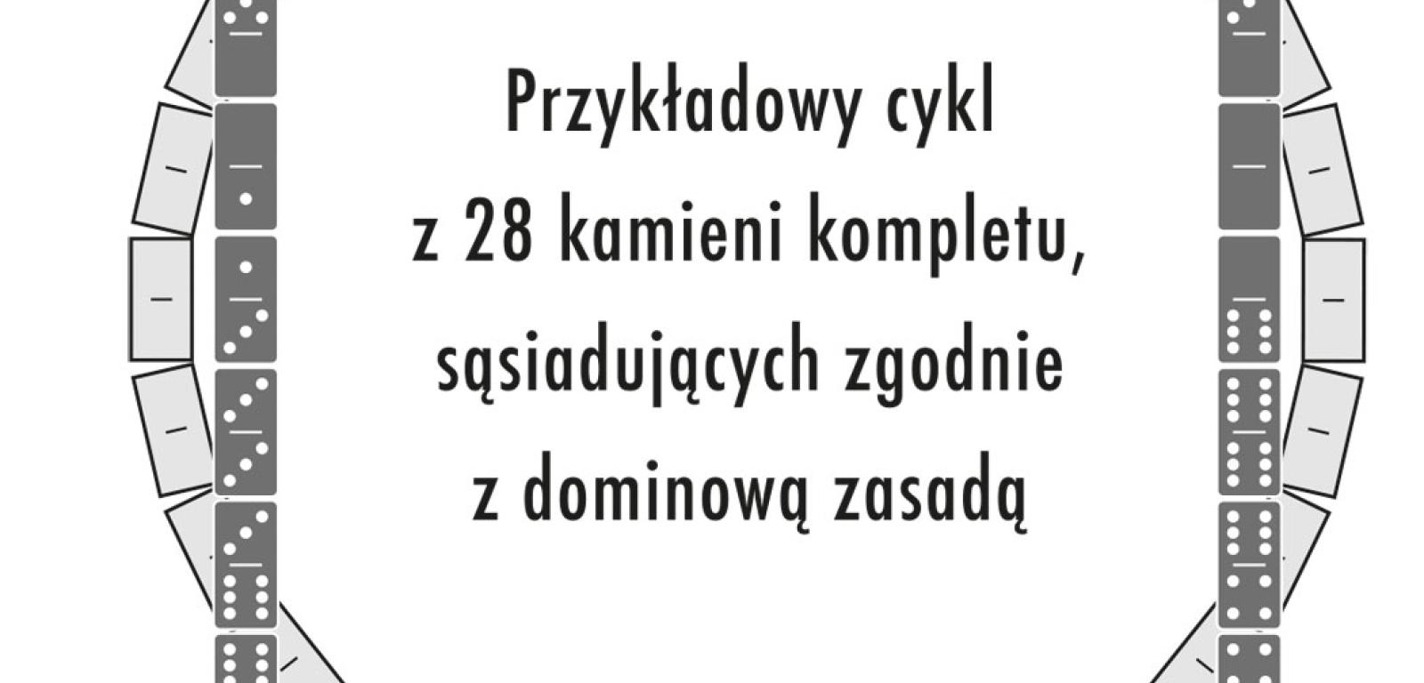 Równie prosta jest struktura kompletu domina. Na połówkach każdego z 28 kamieni znajduje się inna kombinacja pary cyfr ze zbioru {0, 1, 2, 3, 4, 5, 6}, czyli od 0-0 do 6-6 – jak wiadomo cyfry te oznaczone są punktami (oczkami), podobnie jak na kostce do gry. Stąd nazwa kompletu – szóstkowy. Teoretycznie możliwe są mniejsze komplety, pojawiające się wirtualnie w łamigłówkach: piątkowy – 21 kamieni, od 0-0 do 5-5, czwórkowy – 15 kamieni, od 0-0 do 4-4 itd.; praktycznie bywają też większe (np. dziewiątkowy – 55 kamieni obejmujących wszystkie cyfry). W zestawieniu z prostotą struktury zaskoczeniem może być obfitość i złożoność wielu dominowych zagadnień kombinatorycznych. Niektóre z nich były już poruszane w tej rubryce. Pora na kolejny, najbliższy praktycznej grze, bowiem dotyczący układanych z kamieni łańcuchów.