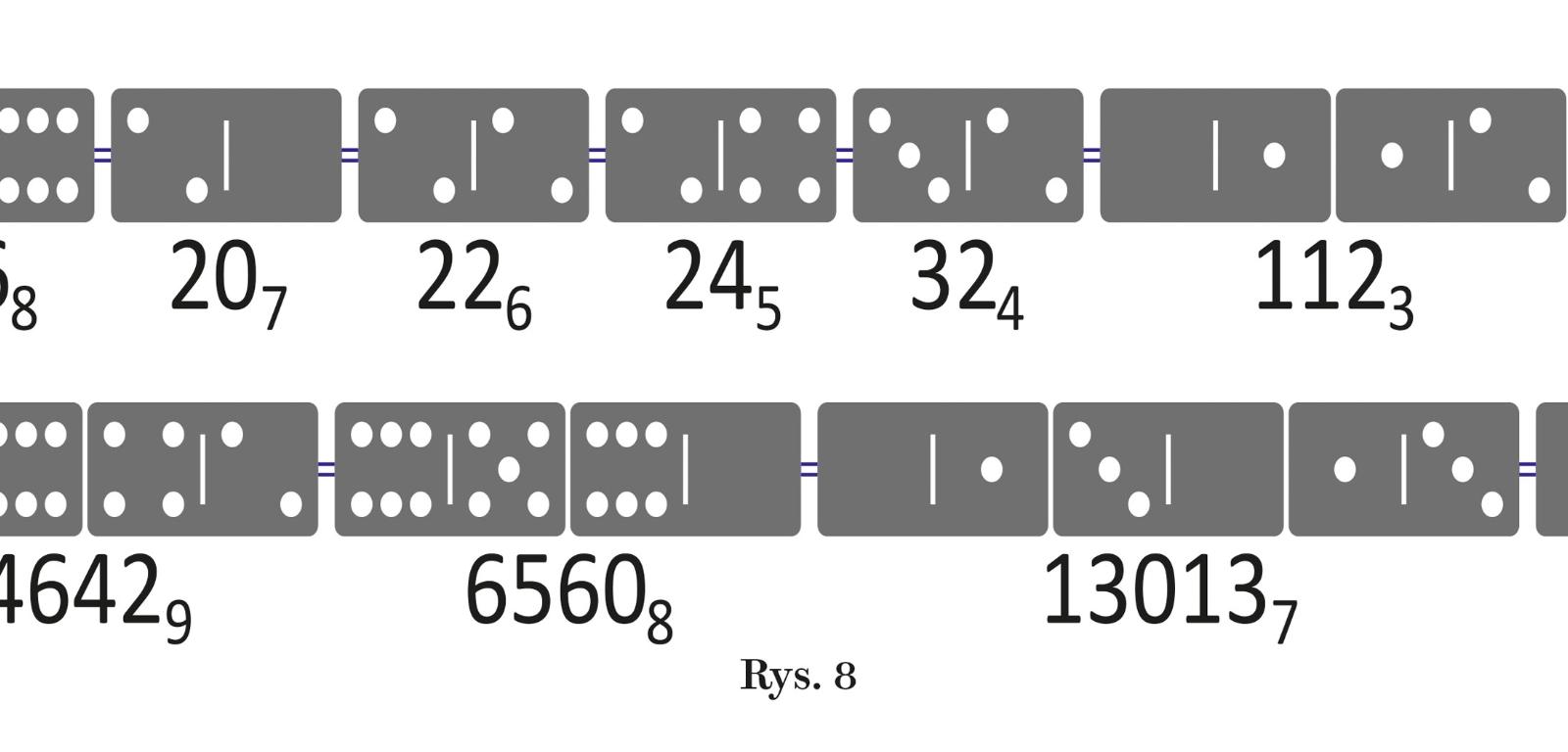 Nie jest znany inny dominowy łańcuch ośmiu równych liczb zapisanych w różnych systemach liczbowych – od dziesiętnego do trójkowego – ułożony z różnych kamieni. Gdy liczba w systemie dziesiętnym składa się z co najmniej dwóch kamieni, to łańcuch na ogół jest formalnie dłuższy, bo ma więcej cyfr, ale liczb jest w nim mniej – kończą się wcześniej, bo łatwiej o powtórki kamieni. Rzadko udaje się dotrzeć nawet do systemu szóstkowego, jak na rys. 8b. W tym przypadku następna byłaby liczba „piątkowa” 1022305, ale w niej powtórnie gościłyby kamienie 0-1 i 0-3.