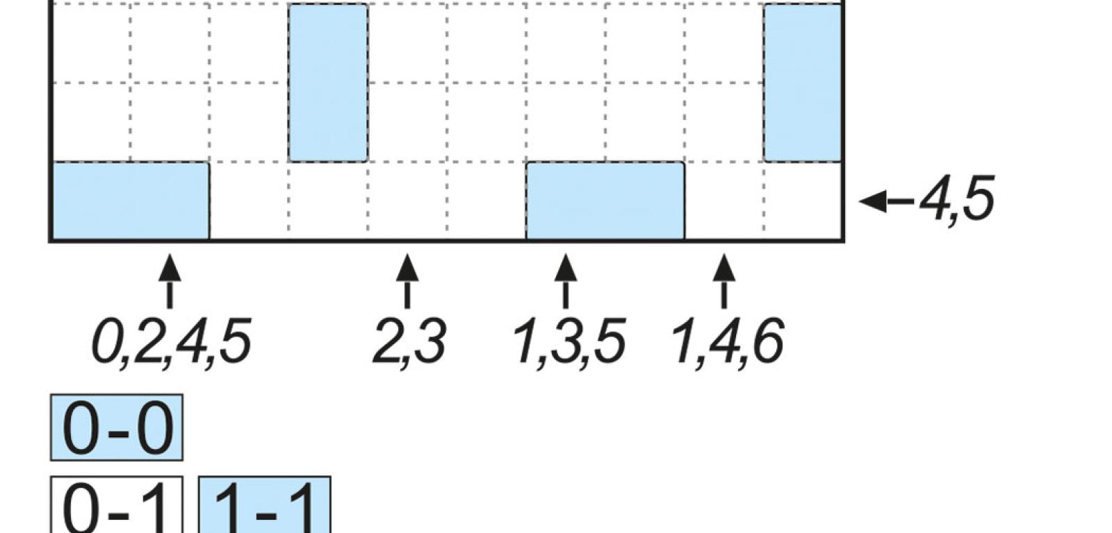 Ujawnione są pozycje wszystkich dubletów (niebieskie). W każdym rzędzie, na który wskazuje strzałka, na połówkach kamieni są wyłącznie cyfry umieszczone obok tej strzałki.
