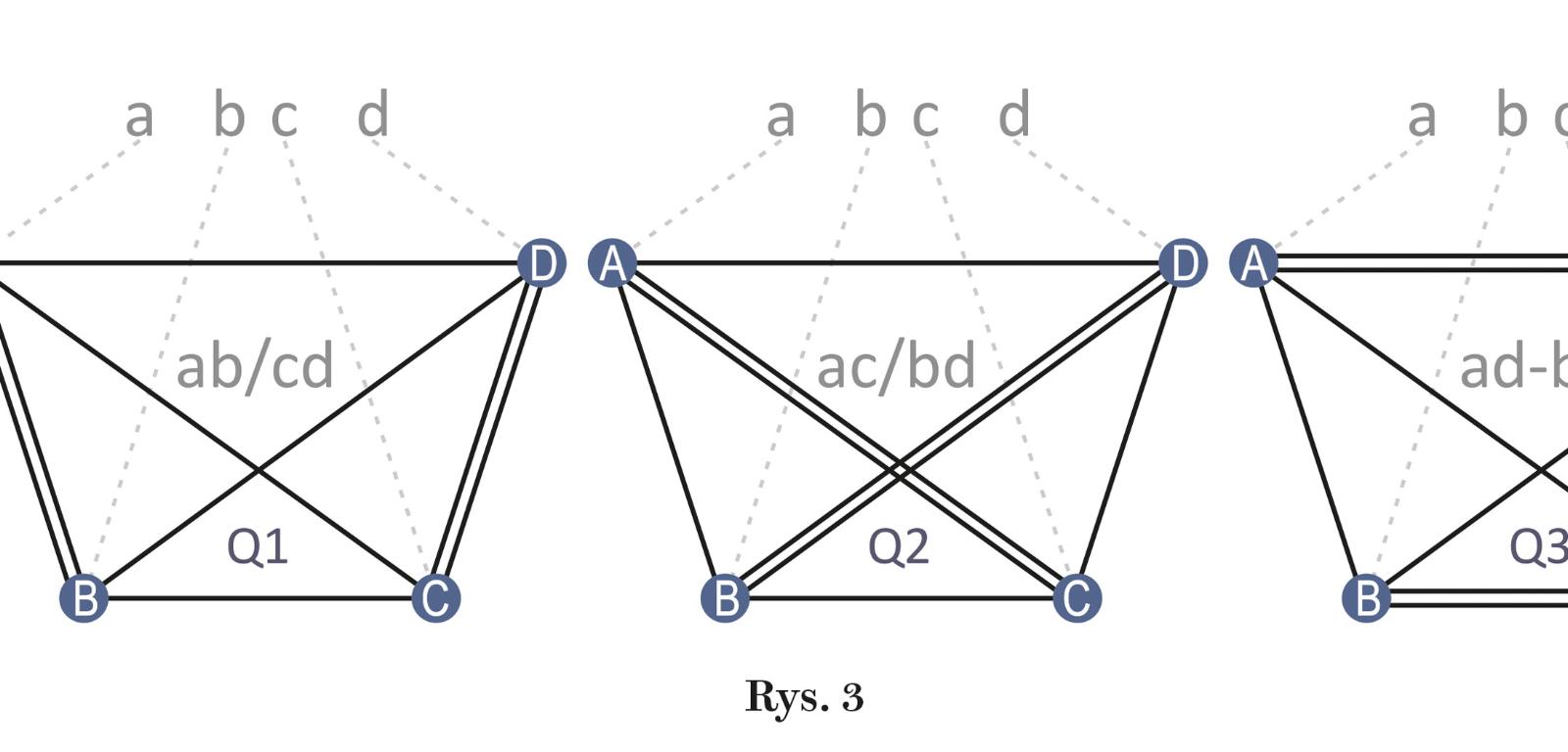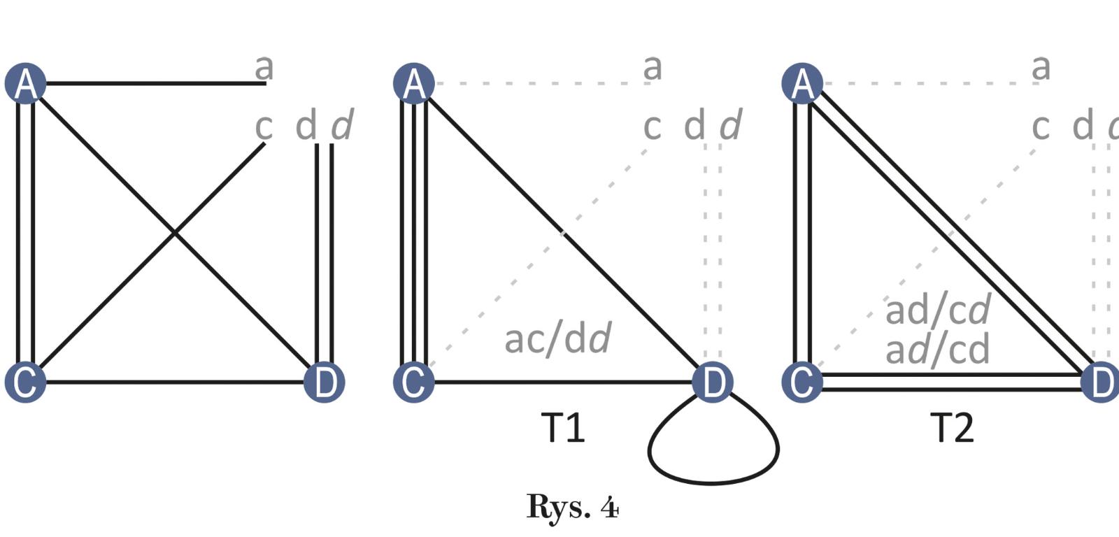 Po połączeniu krawędzi a-b i c-d pojawiają się drugie krawędzie AB i CD, czyli graf Q1. Analogicznie powstają grafy Q2 i Q3. Wszystkie trzy grafy są izomorficzne, czyli jednakowe w tym sensie, że jeśli ich krawędzie potraktować jak elastyczne linki, to odpowiednio je kurcząc, rozciągając i/lub przeciągając poza wierzchołki, można wszystkie grafy przekształcić w jeden graf Q4. Z kolei ten graf poddawany jest podobnej metamorfozie – usunięciu jednego wierzchołka i łączeniu „uwolnionych” krawędzi parami. Tym razem ze względu na podwójną krawędź dd powstaną trzy grafy, a praktycznie dwa – T1 i T2, bo T2 obejmie dwa grafy bliźniacze (rys. 4).