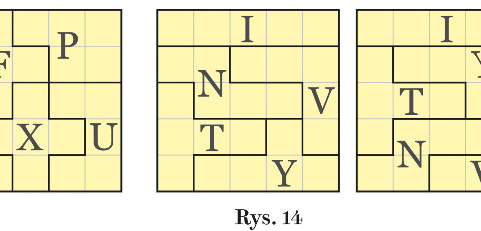 2. Piątki pentomin tworzące kwadraty 5×5: FLPUX i INTVY (drugi kwadrat można ułożyć na dwa sposoby). Pełne rozwiązanie na rys. 14.