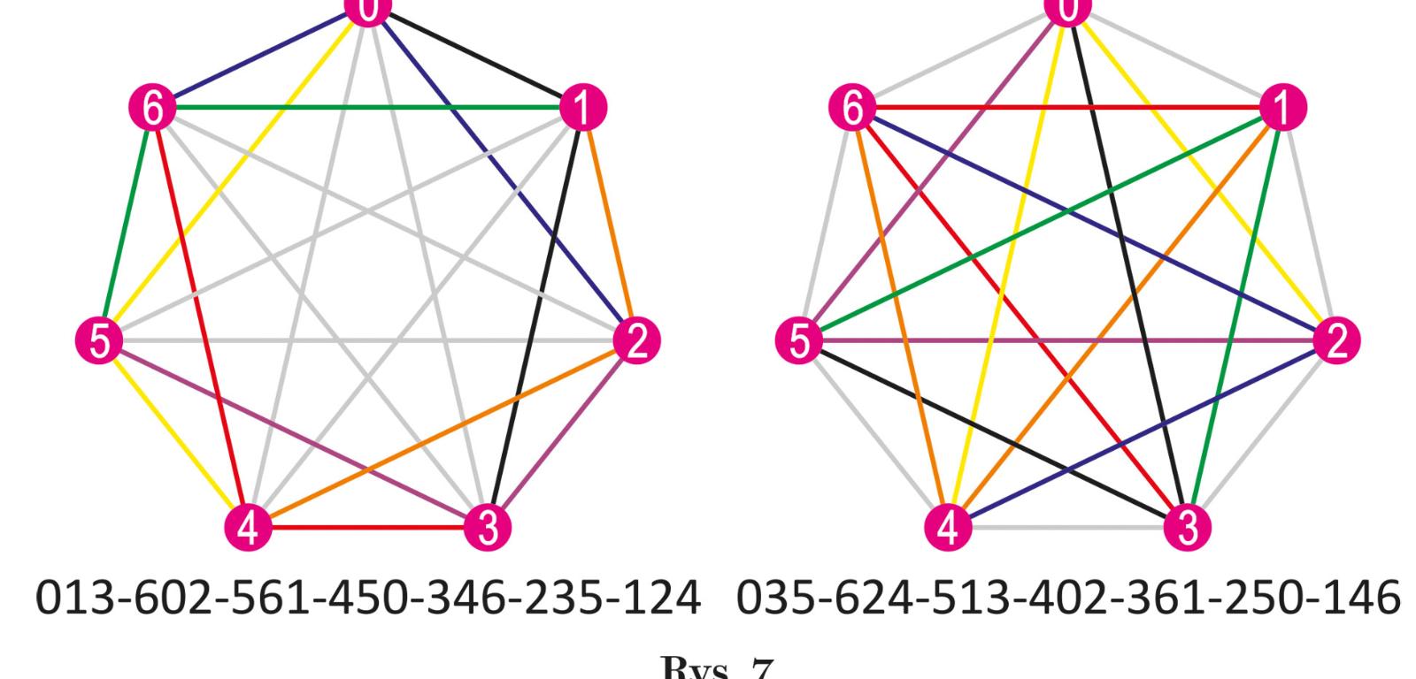 Liczbę cykli w dominowym grafie K7 (bez pętli, czyli bez dubletów) można ograniczyć znacznie poniżej 129 976 320, jeśli uwzględnić permutacje i symetrie obrotowe. W ramach permutacji wystarczy umówić się, że każde dwa cykle, zawierające 7 różnych cyfr (a, b, c, d, e, f, g) – takie, że w jednym z nich wszystkie cyfry a zmieniono na b, b na c, c na d itd., aż do g na a – uznajemy za jednakowe. Takich permutacji jest 7!=5040. Gdyby wśród cykli grafu K7 nie było cykli symetrycznych, to liczba wszystkich cykli byłaby przez 7! podzielna – a nie jest. Pod koniec XIX wieku inny francuski matematyk-amator (z zawodu pułkownik artylerii) Camille Flye Sainte-Marie zauważył, że dwa cykle mają 7-krotną symetrię obrotową (rys. 7), zatem liczba permutacji każdego z nich będzie równa 5040:7=720. Ponadto są 32 cykle z 3-krotną symetrią obrotową (liczba permutacji 5040:3=1680). Pozostaje więc (129976320–2×720–32×1680):5040=25778 cykli niesymetrycznych, a liczba wszystkich cykli po tych zmianach radykalnie maleje – od prawie 130 mln do 25 778+32+2=25 812.