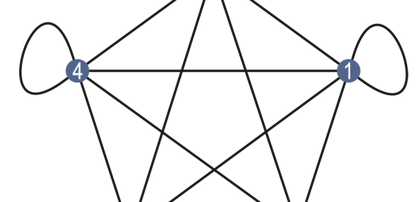 Cyklowi utworzonemu z piętnastu kamieni czwórkowego kompletu odpowiada tzw. pełny graf eulerowski z pętlami (rys. 2). „Pełny” oznacza, że każde dwa punkty są ze sobą połączone linią (krawędzią); „eulerowski” – bo z każdego punktu (wierzchołka) wychodzi parzysta liczba krawędzi; „pętla” jest krawędzią łączącą dany wierzchołek z nim samym. Cyfry przy wierzchołkach odpowiadają cyfrom na połówkach kamieni, zatem każda krawędź odpowiada kamieniowi z takimi cyframi na jego połówkach, jakie są na końcach tej krawędzi, a pętle oznaczają dublety, czyli kamienie z jednakową cyfrą na obu połówkach.