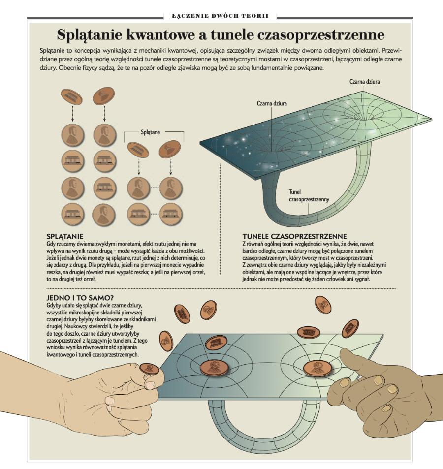 Równoważność ta może mieć głębokie konsekwencje, może się bowiem okazać, że sama czasoprzestrzeń powstaje ze splątania bardziej podstawowych, mikroskopijnych składników Wszechświata. Wynika z niej także, że splątane obiekty – pomimo że uważano je za pozbawione fizycznego połączenia – mogą być powiązane ze sobą w znacznie prostszy sposób, niż myśleliśmy. Co więcej, związek między splątaniem a tunelami czasoprzestrzennymi może pomóc w opracowaniu zunifikowanej teorii mechaniki kwantowej i czasoprzestrzeni – czegoś, co fizycy nazywają kwantową grawitacją – która wyprowadzi prawa fizyki rządzące makroskopowym światem z oddziaływań obowiązujących w rzeczywistości atomowej i subatomowej. Taka teoria jest konieczna dla zrozumienia Wielkiego Wybuchu i wnętrza czarnych dziur.