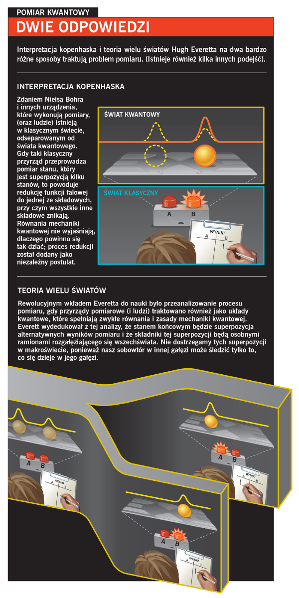 W kwantowym świecie cząstka elementarna lub zbiór takich cząstek może istnieć w superpozycji dwóch lub więcej stanów. Na przykład elektron może być w superpozycji różnych położeń, prędkości i orientacji swojego spinu. I zawsze, mierząc jedną z tych wielkości, otrzymamy konkretny wynik – dokładnie jeden z elementów tej superpozycji, ale nie ich kombinację. Nigdy też nie zobaczyliśmy superpozycji makroskopowych obiektów. Problem pomiaru sprowadza się do pytania: jak i dlaczego jednoznaczny świat naszych wrażeń wyłania się z wielu możliwości dostępnych jako elementy kwantowego świata?