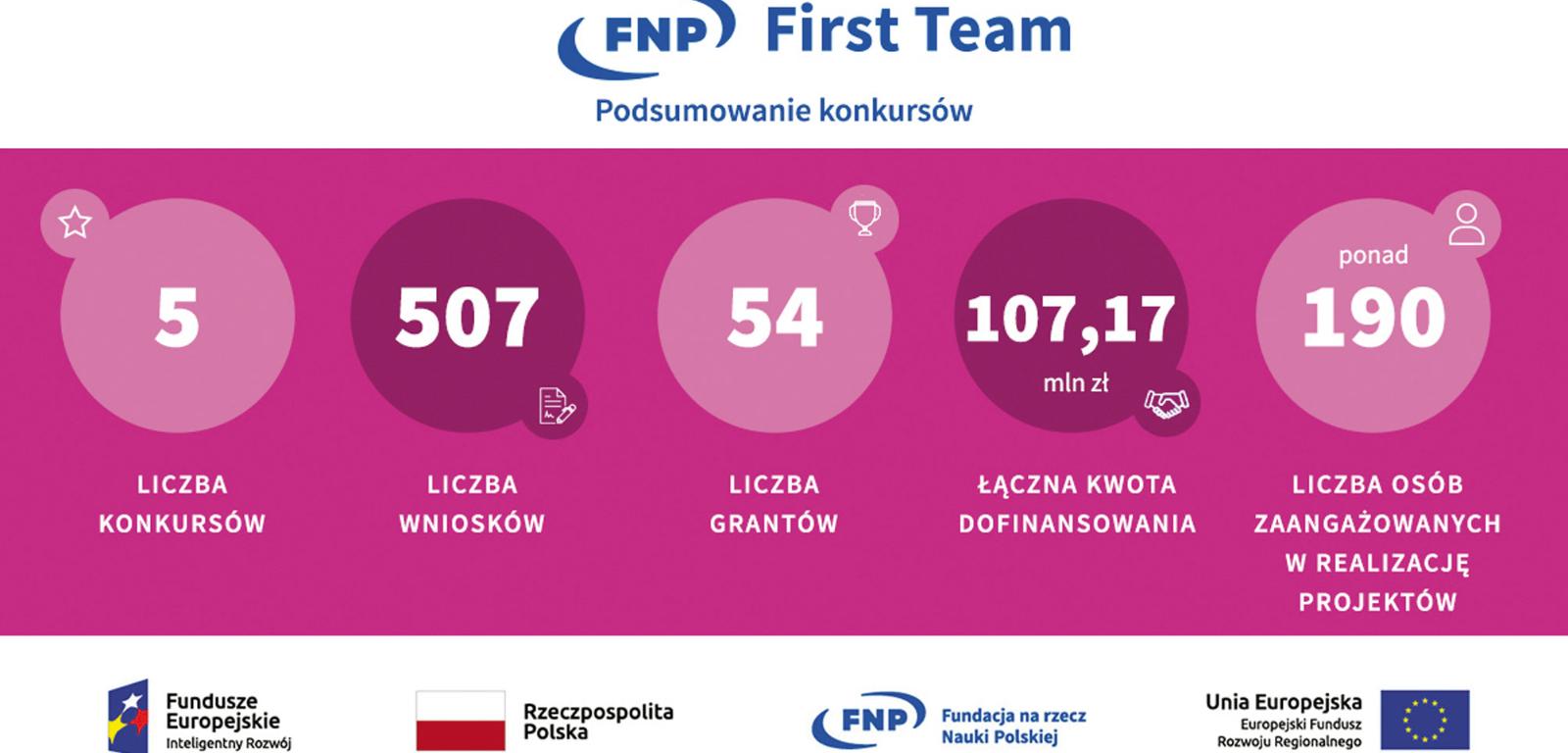 W programie FIRST TEAM Fundacja wspiera młodych doktorów w budowaniu samodzielności naukowej, przyznając im po około 2 mln zł na realizację projektów zespołowych i podejmowanie najciekawszych wyzwań badawczych. Granty są finansowane ze środków z Programu Operacyjnego Inteligentny Rozwój (PO IR).