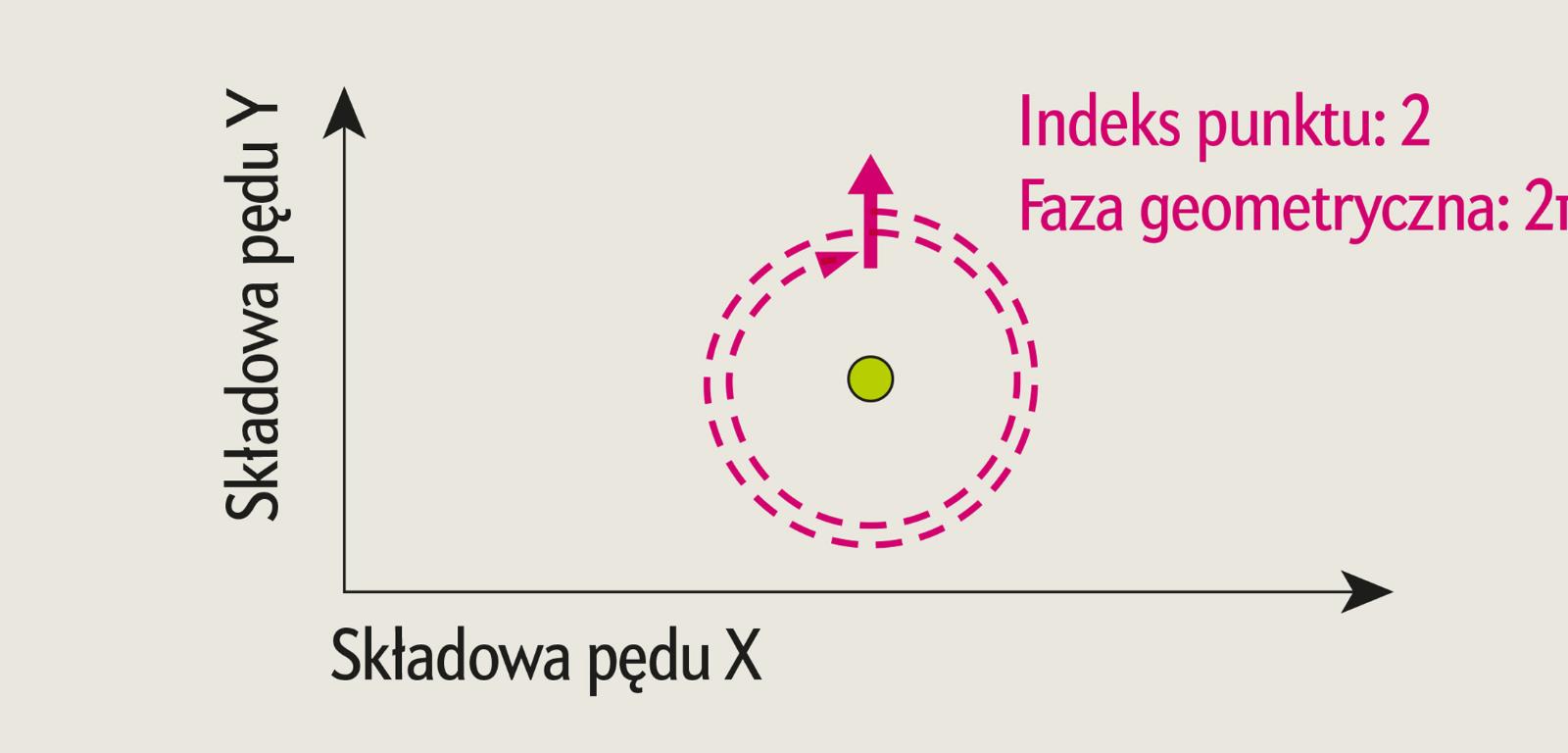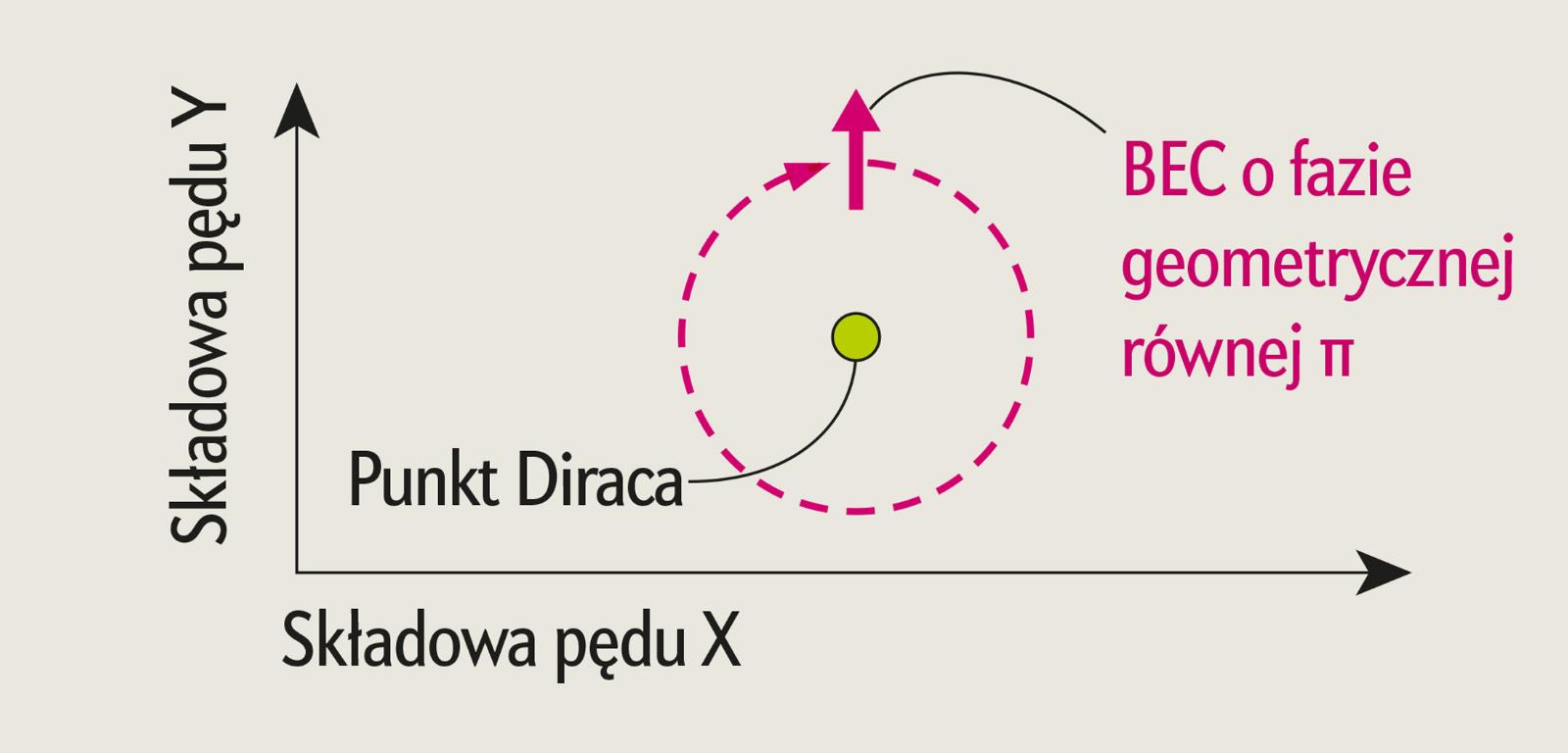 Zanim rozpoczęliśmy nasz eksperyment, przeprowadzony w Niemczech podobny projekt ze sztucznymi kryształami pokazał, co się dzieje, gdy kondensat porusza się po kołowej ścieżce wokół punktu Diraca. Zespół niemiecki manipulował pędem BEC w taki sposób, aby przyjmował on wartości, które kreśliły okrąg na wykresie pędu w lewo w stosunku do pędu w górę i w dół. Podczas przechodzenia przez te transformacje BEC nigdy nie dotknął punktu Diraca. Niemniej jednak poruszanie się wokół punktu w taki właśnie sposób spowodowało, że kondensat uzyskał coś, co nazywa się fazą geometryczną. Faza geometryczna to matematyczny termin pojawiający się w opisie fazy kwantowej, która określa sposób ewolucji. Chociaż nie ma fizycznej interpretacji fazy geometrycznej, jest to bardzo nietypowa własność mechaniki kwantowej. Nie każdy stan kwantowy ma fazę geometryczną, więc fakt, że BEC ją uzyskał, jest wyjątkowy. Jeszcze bardziej wyjątkowe jest to, że faza ta wynosiła dokładnie p.